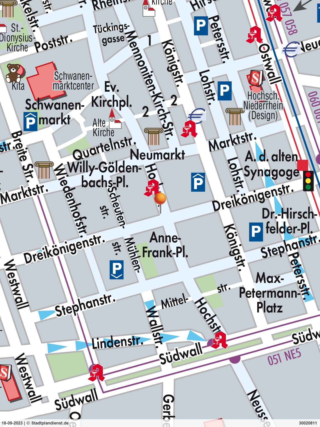 • Das tolle Eckladenlokal befindet sich in der Krefelder-Fußgängerzone (Hochstraße) in der Nähe des Neumarktes. In der Nachbarschaft ist eine Vielfalt von Geschäften vertreten. Innerhalb weniger Gehminuten befinden sich die Haltestellen der öffentlichen Verkehrsmittel auf Ost- und Südwall, wo alle Krefelder Straßenbahnlinien und eine große Anzahl von Buslinien genutzt werden können. Auch der Hauptbahnhof ist nur wenige Gehminuten entfernt. Öffentliche Parkplätze für Ihre Kunden befinden sich in direkter Umgebung.