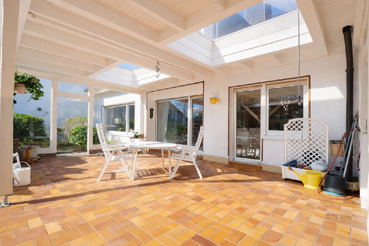 Terrasse/Balkon: Sehr großzügige und überdachte Terrasse im Fachwerkstil mit Glaseinsätzen. Die eingebauten Lichtkuppeln können geöffnet werden.