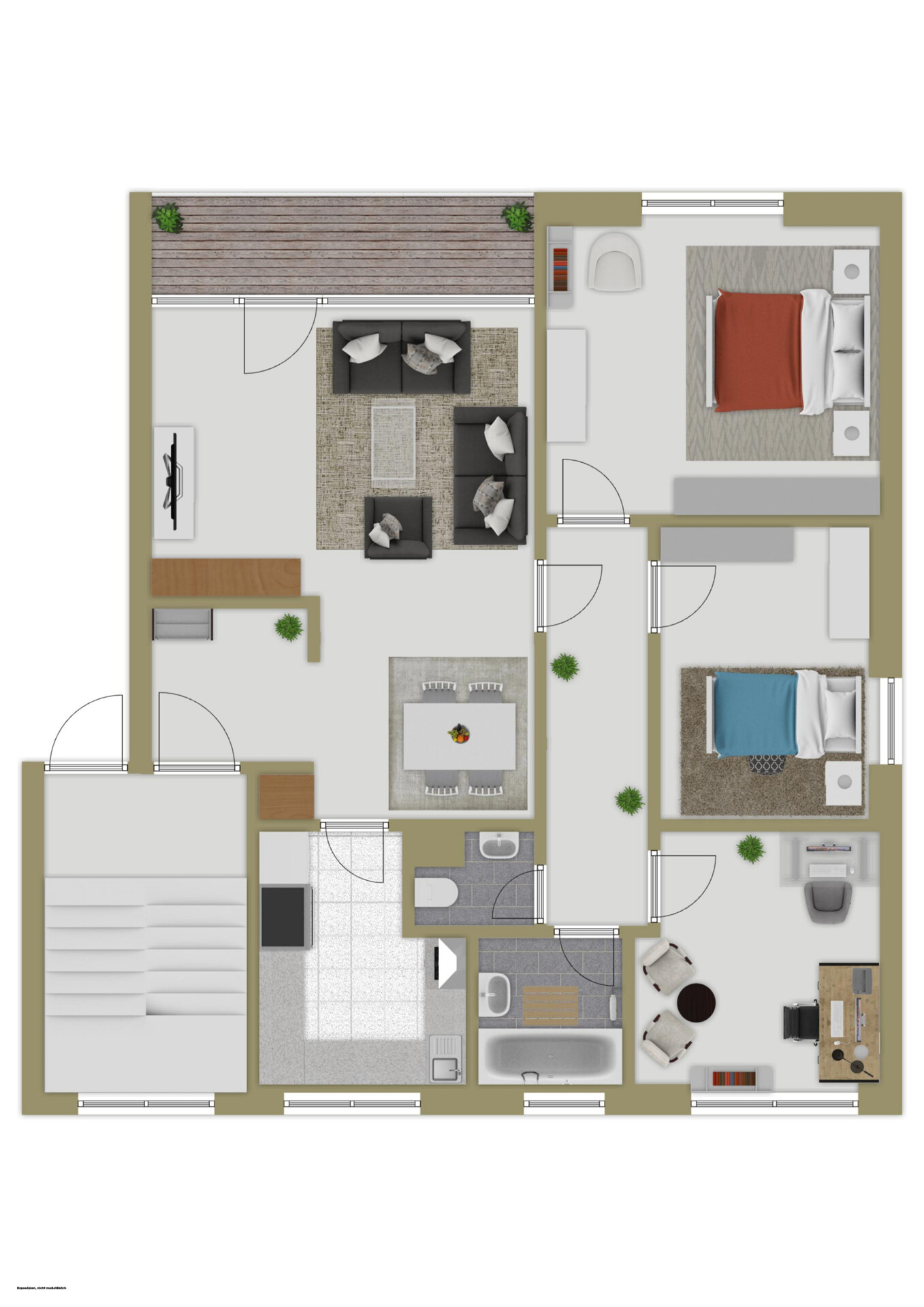 Der private Bereich ist durch eine Zwischentür abgetrennt und schafft Ruhe und Rückzug. Drei zusätzliche Zimmer bieten flexible Nutzungsmöglichkeiten als Schlafzimmer, Kinderzimmer, Büro oder Hobbyraum. Das Tageslichtbad mit Badewanne sorgt für entspannte Momente, ergänzt durch ein separates WC für zusätzlichen Komfort.