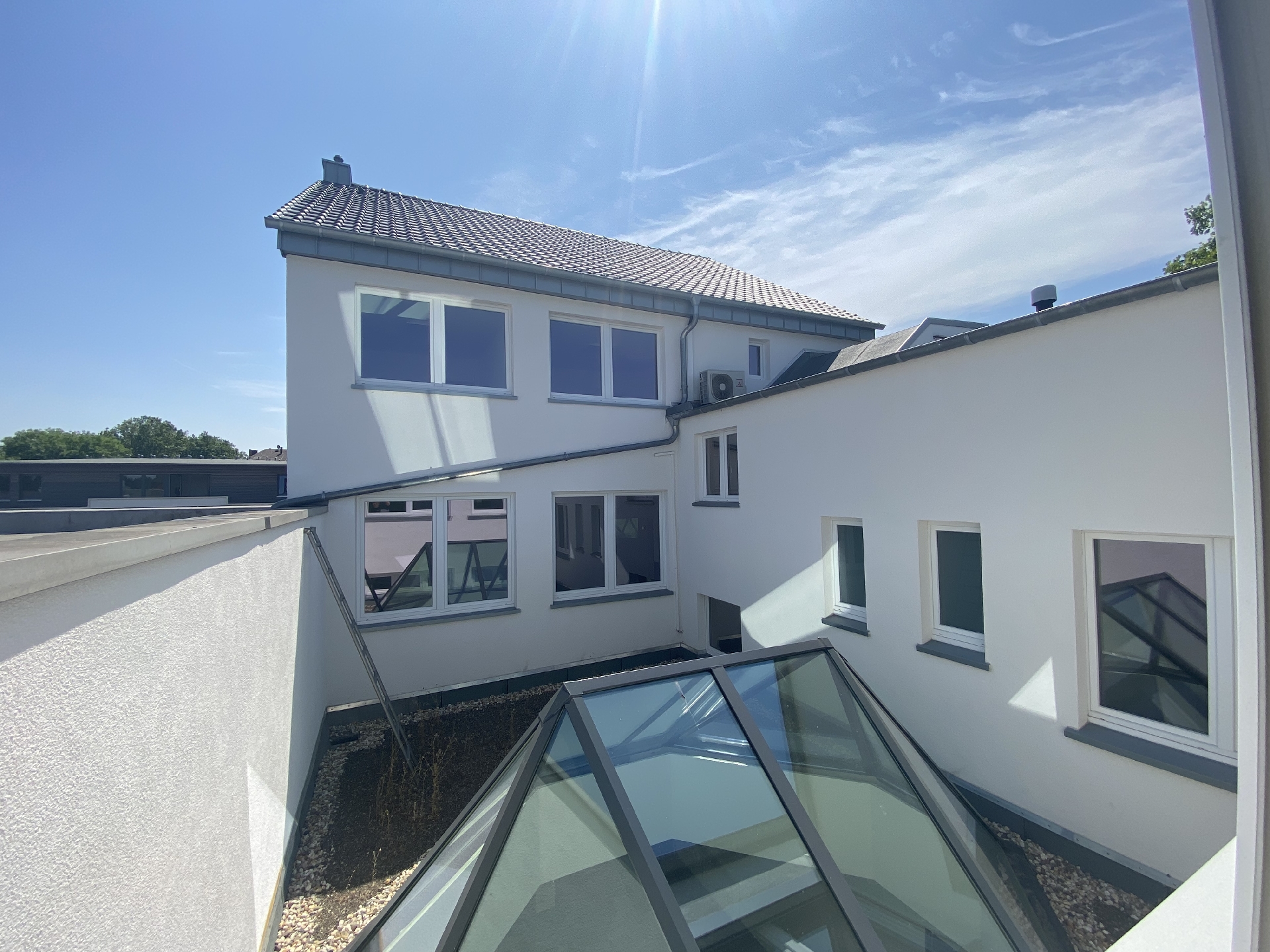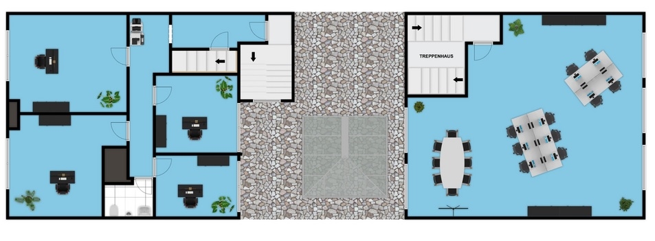 Das 2. Obergeschoss verfügt über vier abgeschlossene Büros mit Glastüren, sowie einen großzügigen, Konferenzraum, der sich ideal für Besprechungen oder Schulungen eignet. Alle Räume sind klimatisiert. Zwei der Büros sind größer geschnitten und durch leichte Dachschrägen architektonisch markant – ideal für Doppel- oder Führungsbüros. Ein separates WC ist ebenfalls vorhanden.