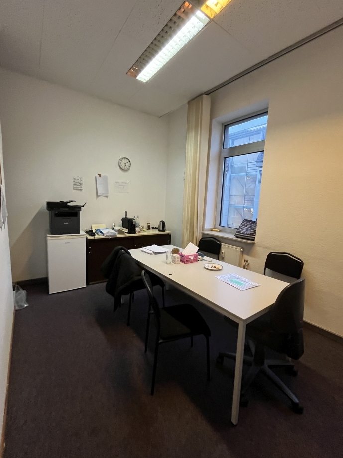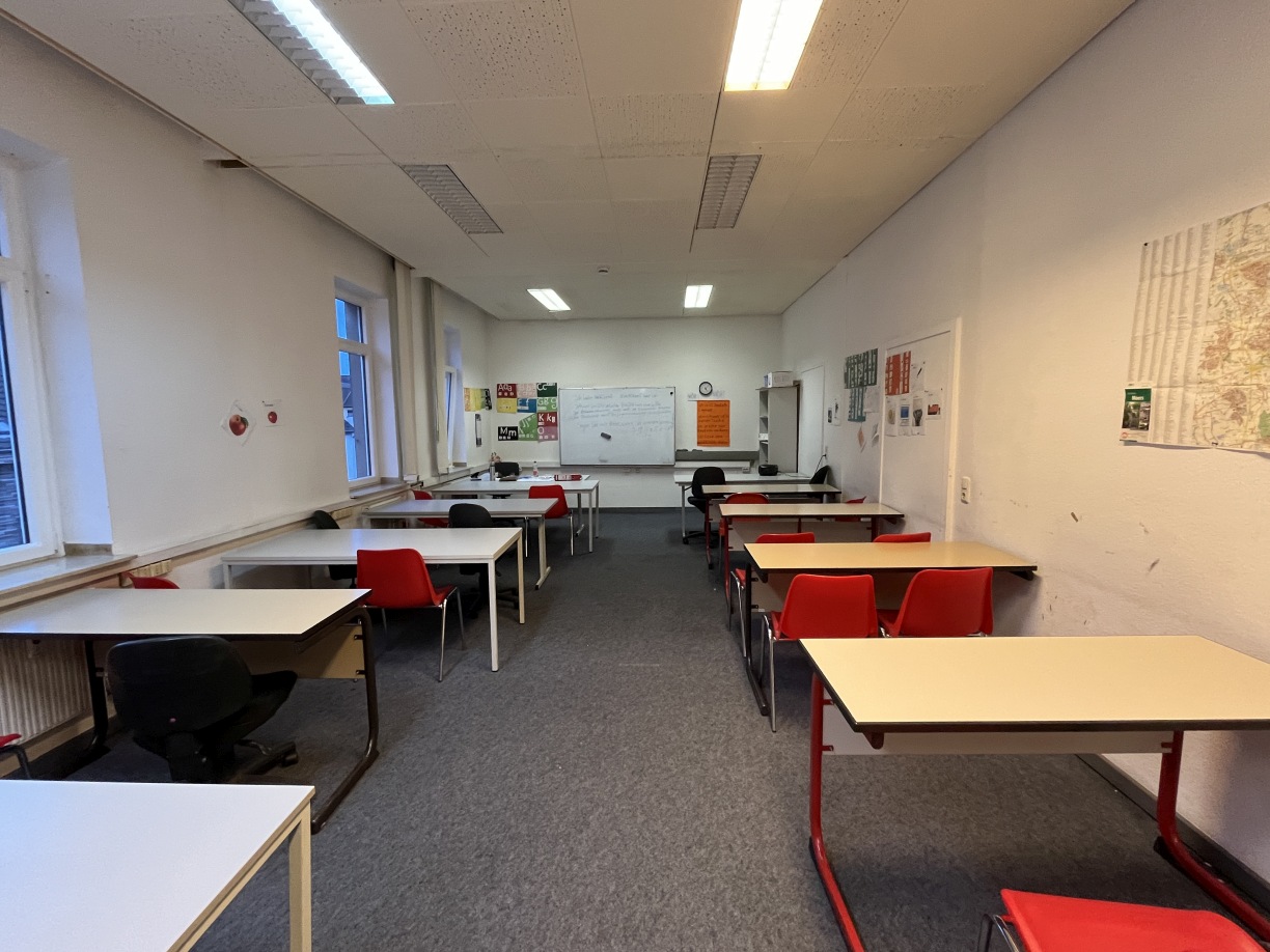 Die Schulungsräume mit eigenem Eingang von der Homberger Straße aus sind dagegen relativ einfach aber zweckmäßig ausgestattet. Die Fenster sind überwiegend aus Kunststoff und isolierverglast, die Böden sind mit Nadelfilz oder Laminat ausgelegt. Es stehen in den Vollgeschossen jeweils nach Geschlechtern getrennte, einfache WC-Anlagen zur Verfügung. Die Beheizung erfolgt über einen Fernwärmeanschluss.