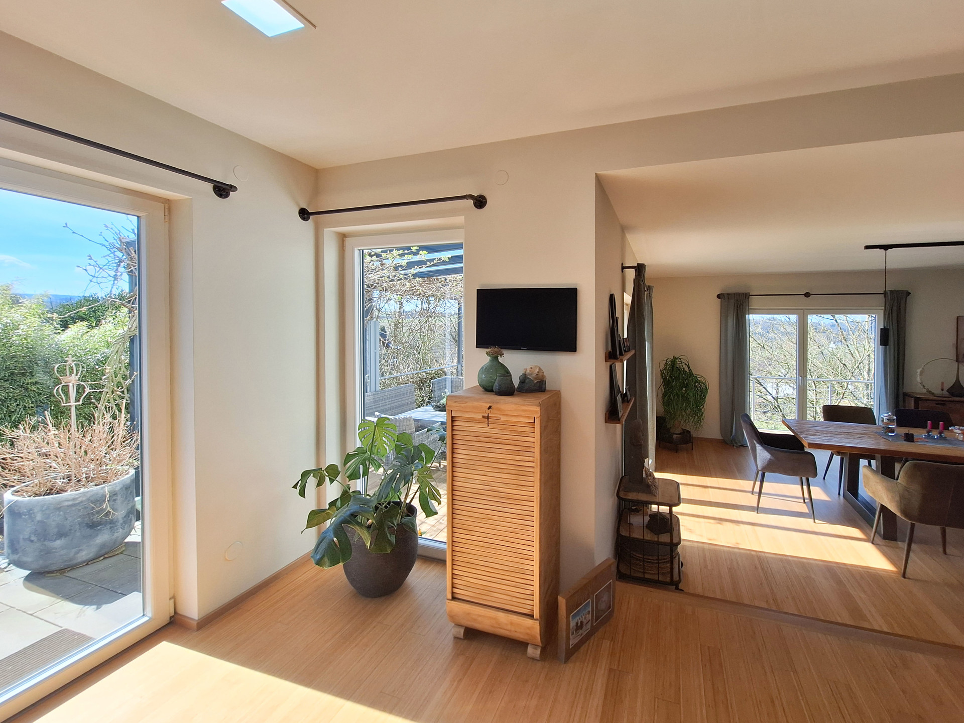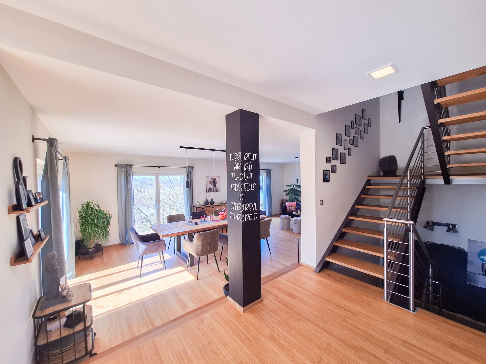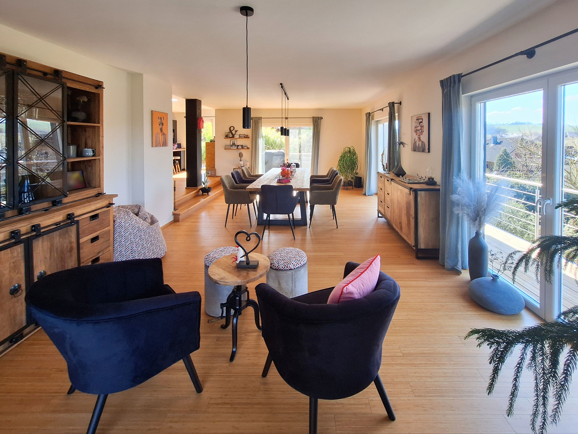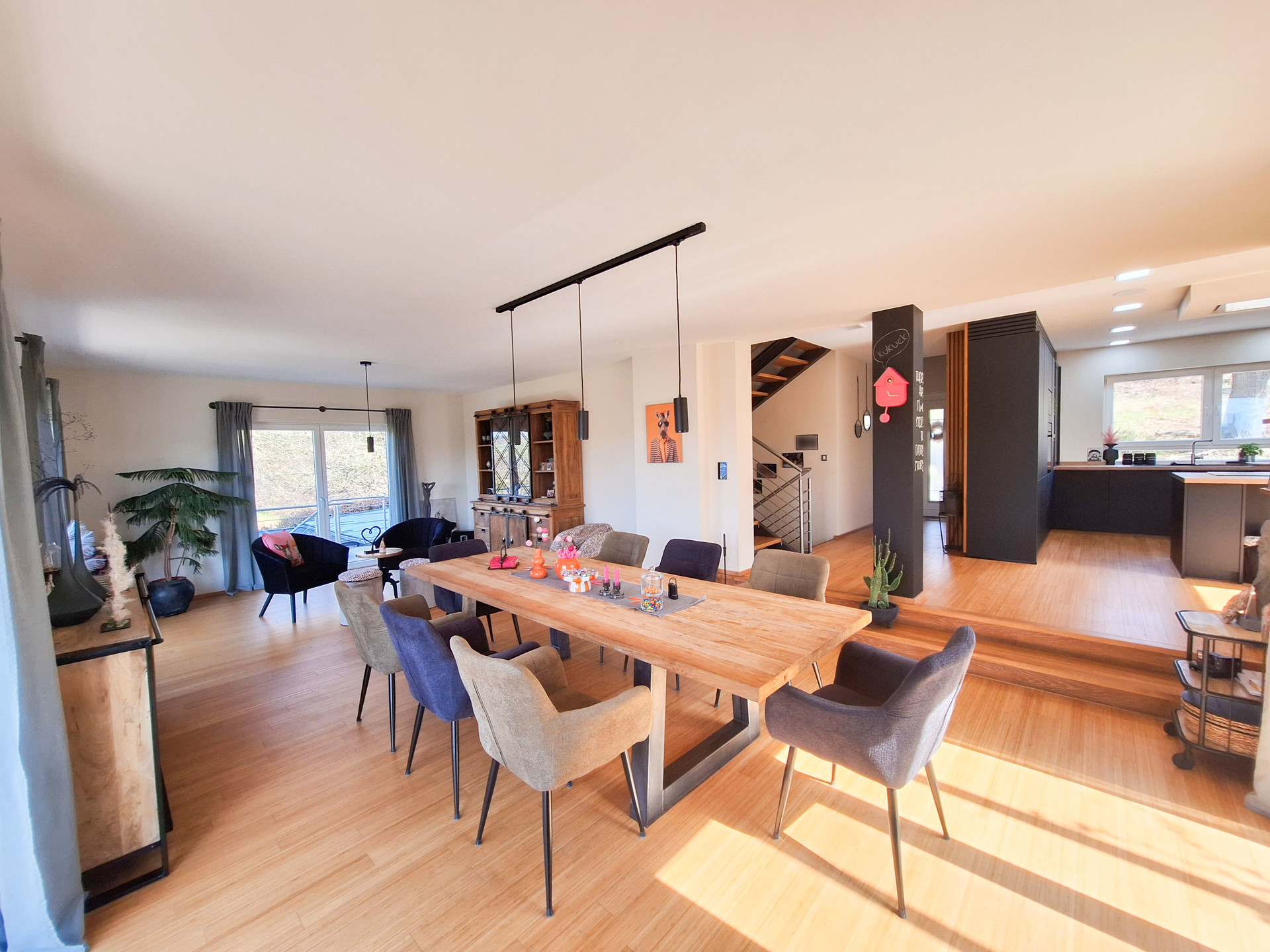 • Dieses hochwertige Einfamilienhaus aus 2004 befindet sich in einer idyllischen Höhenlage und bietet Ihnen eine perfekte Kombination aus moderner Architektur und hochwertigem Wohnkomfort. Die Wohnfläche von ca. 264 m² bietet ausreichend Platz und ist ideal für Familien, die großzügige und lichtdurchflutete Räume schätzen. Die Innenausstattung wurde mit viel Liebe zum Detail modern gestaltet und überzeugt durch hochwertige Materialien sowie eine durchdachte Raumaufteilung. Erst im letzten Jahr wurde eine neue, stilvolle Küche eingebaut, die Wände gestrichen und die Treppenstufen aus Eichenholz sowie der Bambusboden aufbereitet.