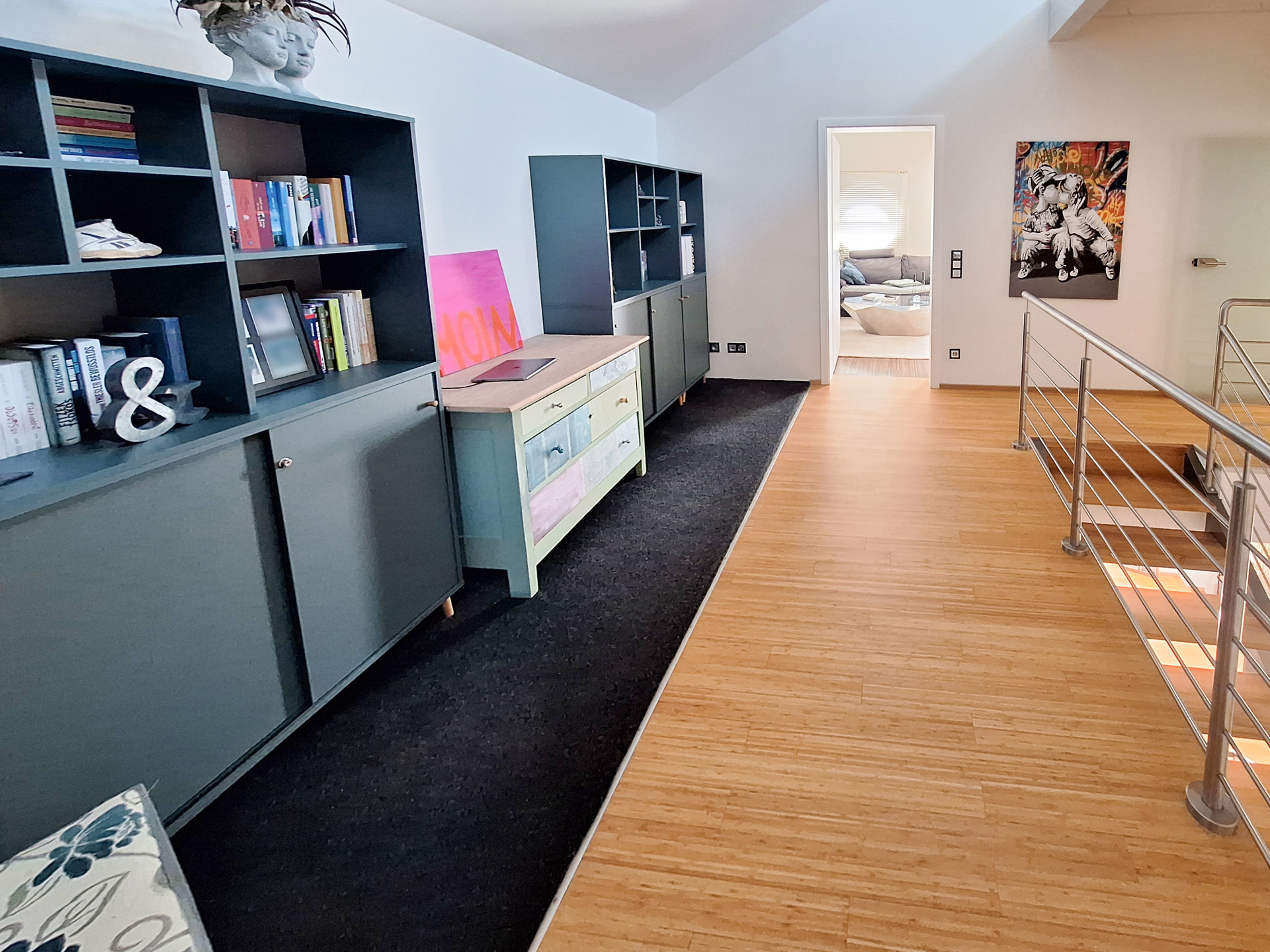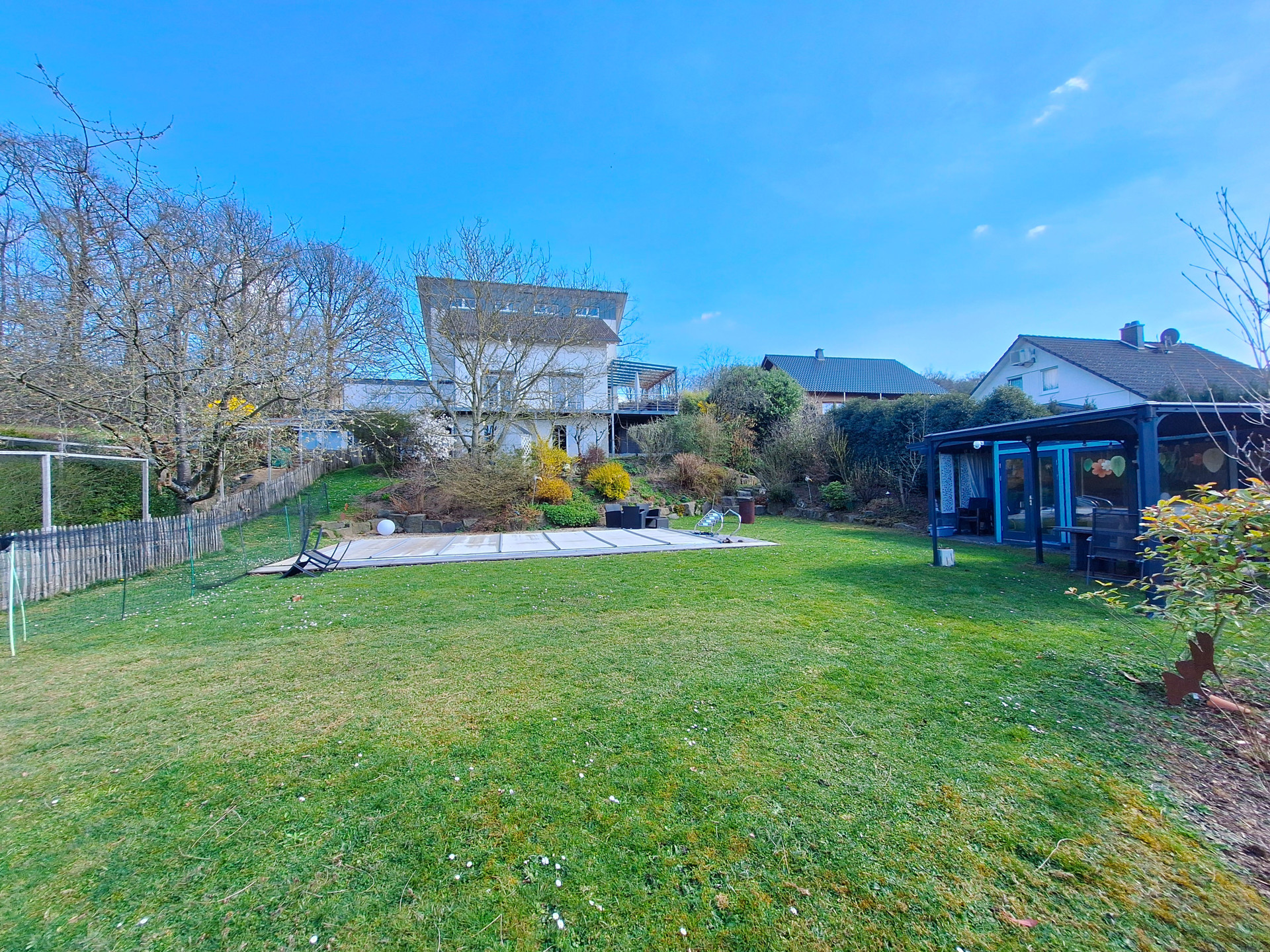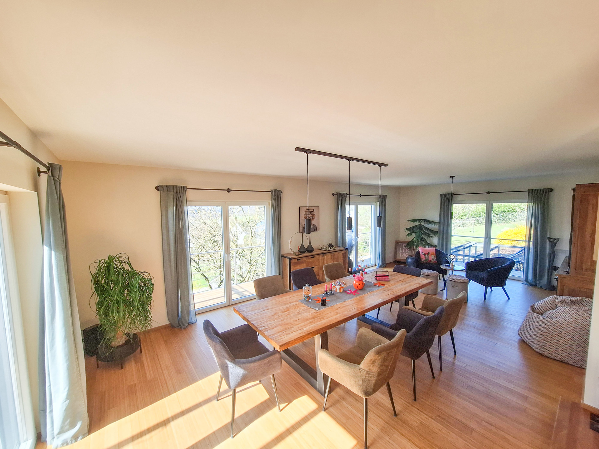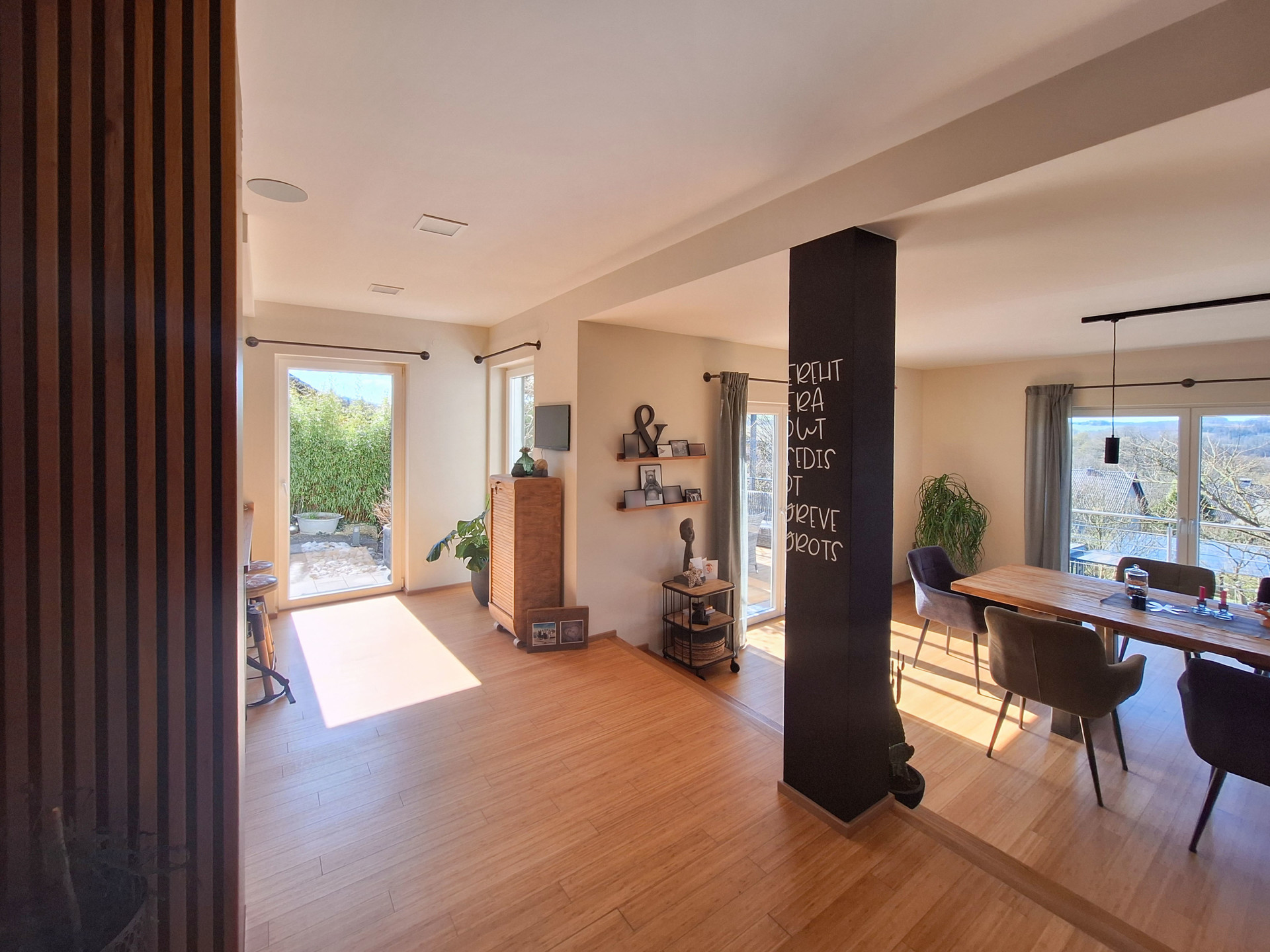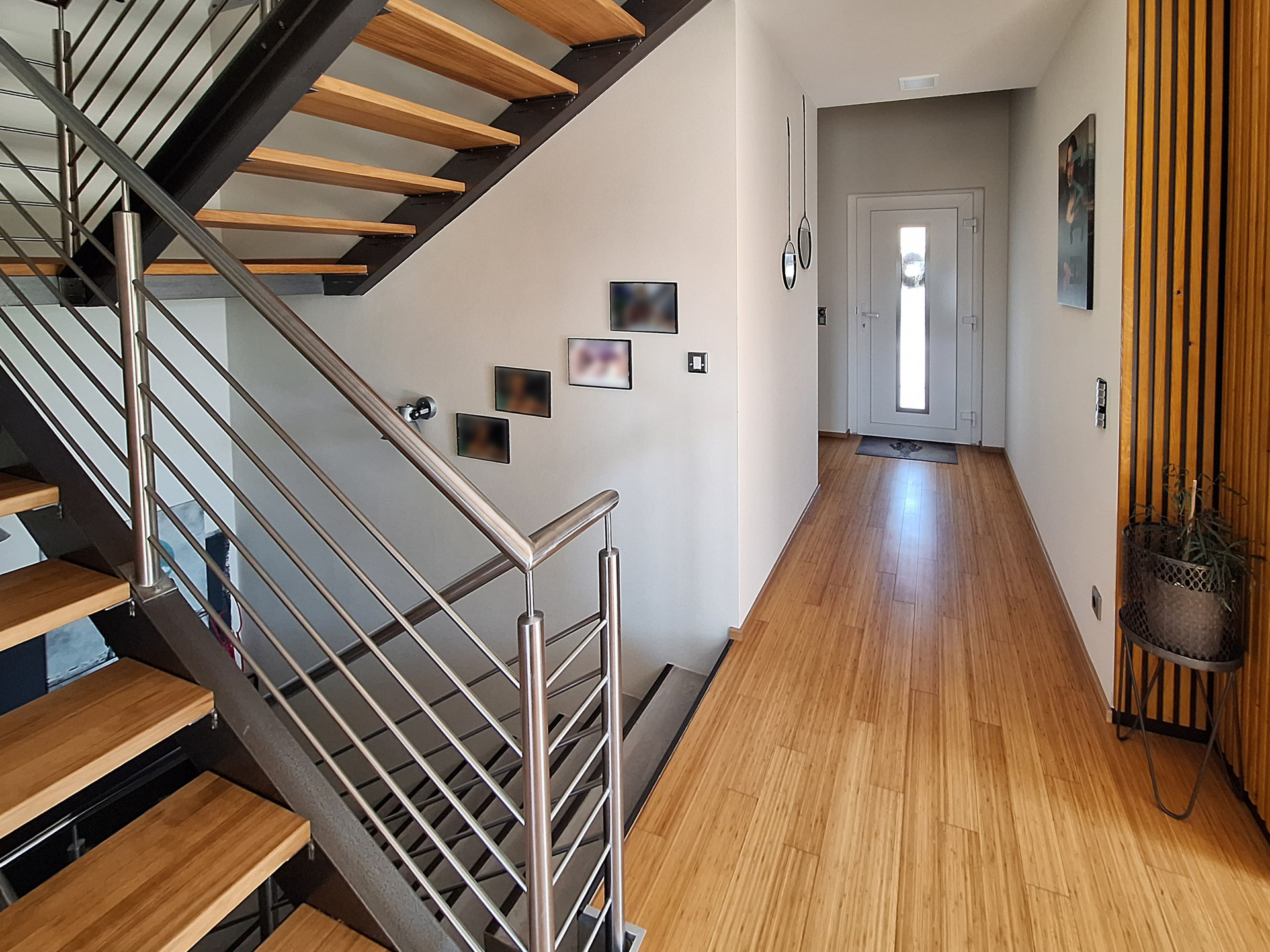 • Dieses hochwertige Einfamilienhaus aus 2004 befindet sich in einer idyllischen Höhenlage und bietet Ihnen eine perfekte Kombination aus moderner Architektur und hochwertigem Wohnkomfort. Die Wohnfläche von ca. 264 m² bietet ausreichend Platz und ist ideal für Familien, die großzügige und lichtdurchflutete Räume schätzen. Die Innenausstattung wurde mit viel Liebe zum Detail modern gestaltet und überzeugt durch hochwertige Materialien sowie eine durchdachte Raumaufteilung. Erst im letzten Jahr wurde eine neue, stilvolle Küche eingebaut, die Wände gestrichen und die Treppenstufen aus Eichenholz sowie der Bambusboden aufbereitet.