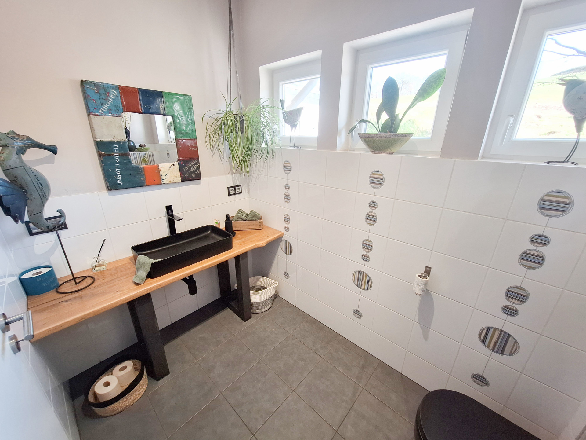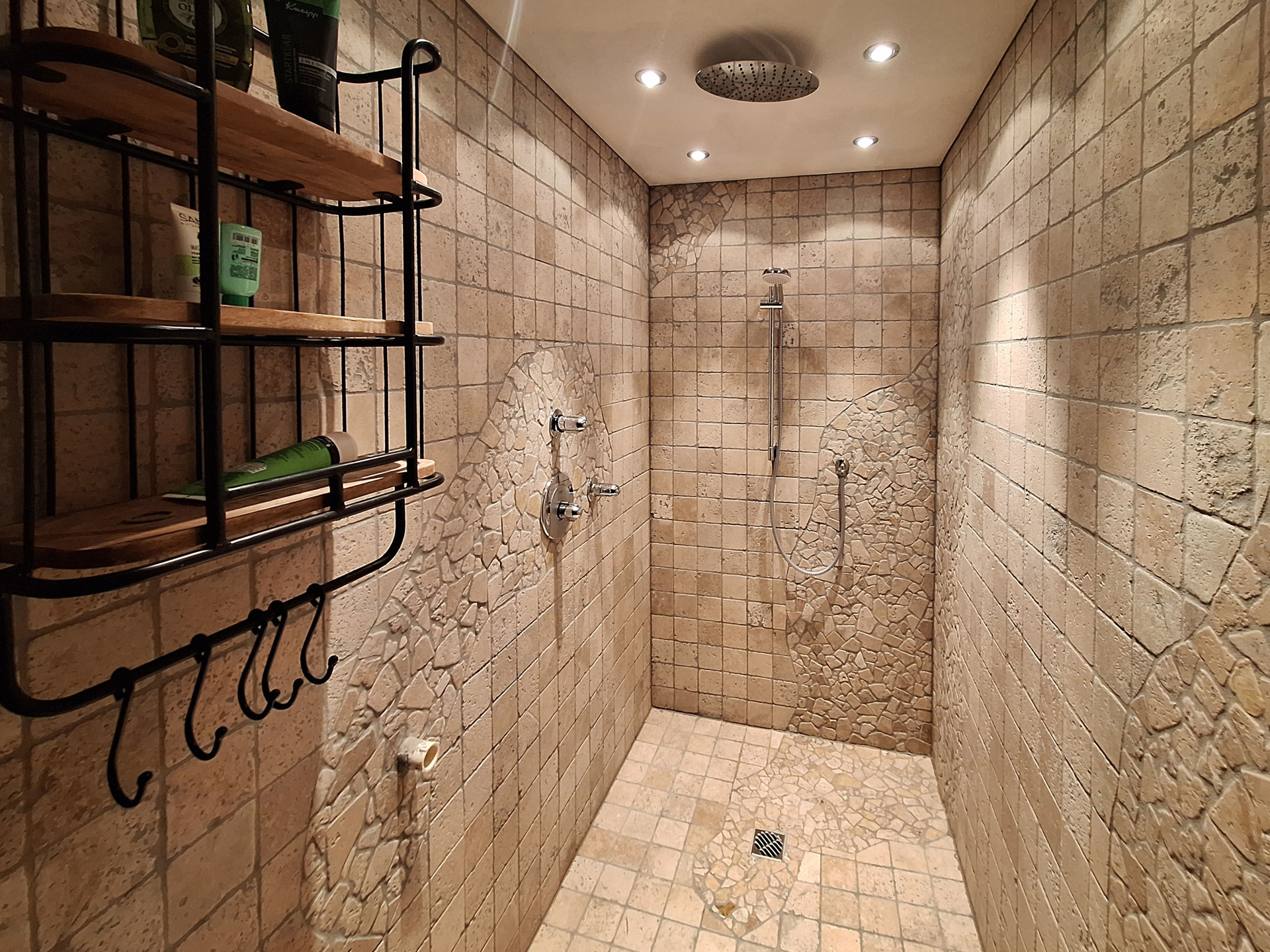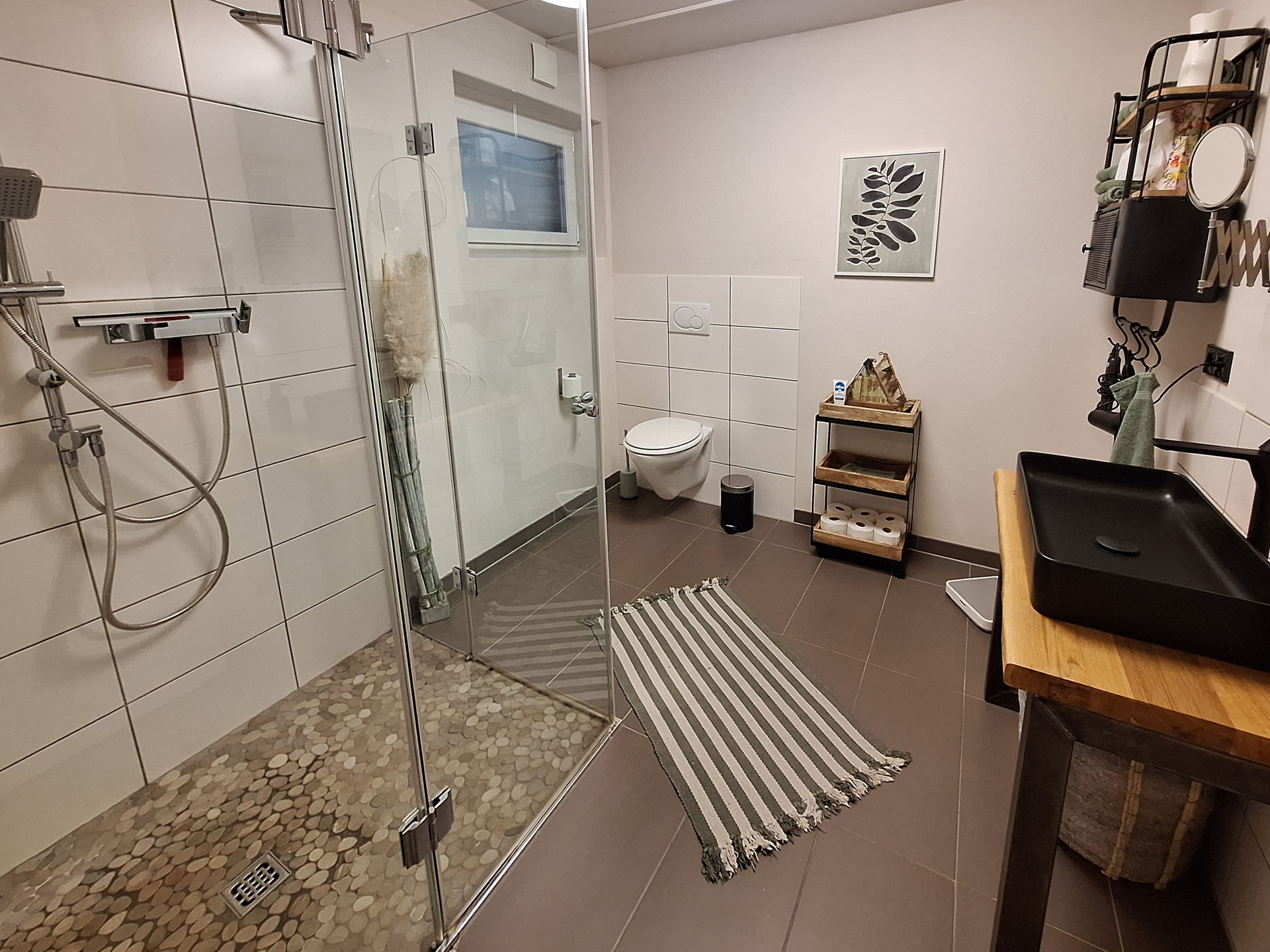 – Boden mit Fliesen, Echtholz Bambusboden und fugenlosen Boden in Betonoptik ausgesttatet