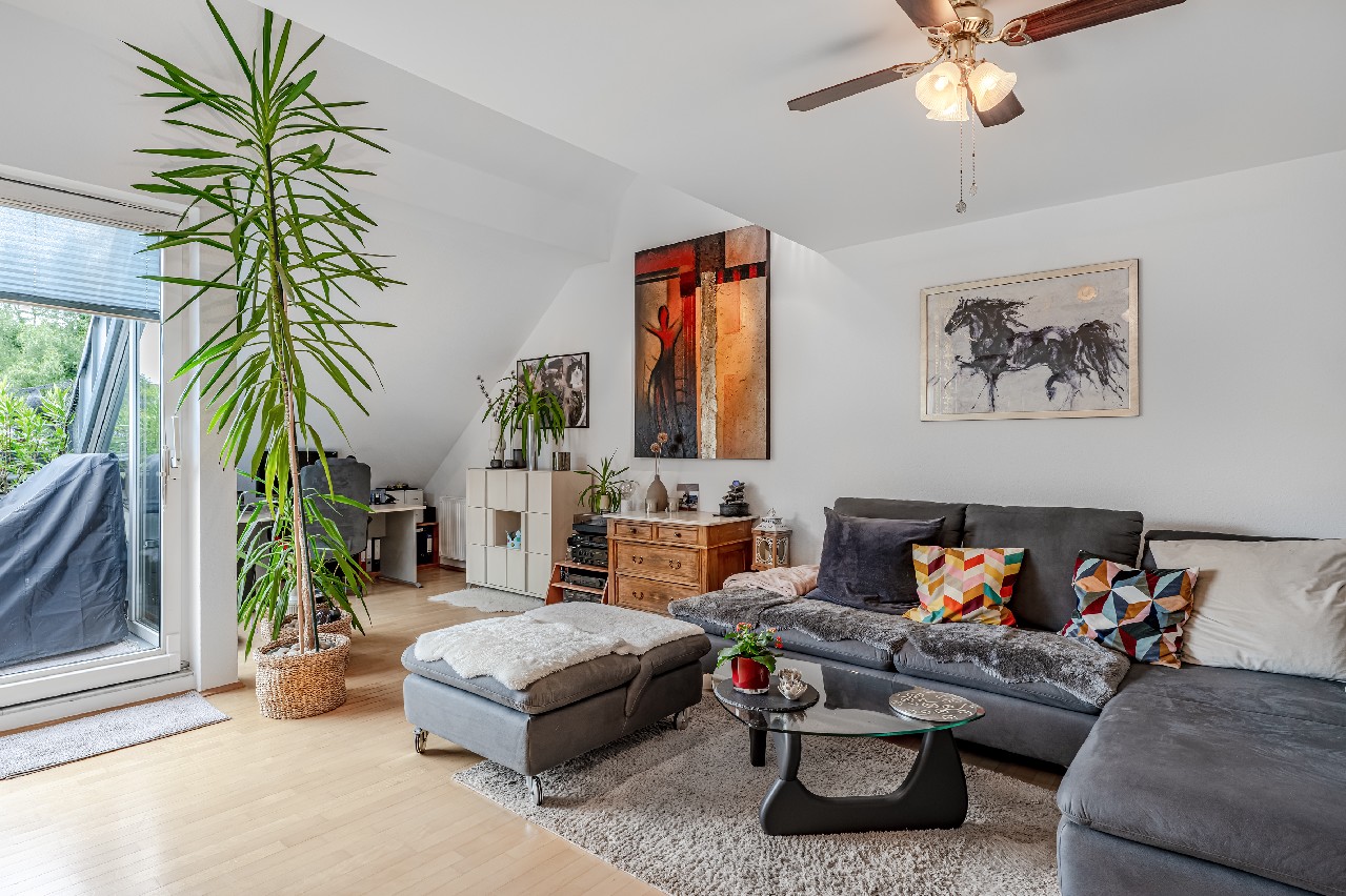 Eine filigrane Wendeltreppe führt ins Galeriegeschoss. Hier beeindruckt besonders der offene Galeriebereich mit Blick in das darunterliegende Geschoss – die großzügige Deckenhöhe und der Lichteinfall schaffen ein luftiges, beinahe loftartiges Wohngefühl. Das Galeriegeschoss beherbergt ein geräumiges Elternschlafzimmer mit praktischen Einbauschränken sowie ein Tageslichtbad mit Dusche und Eckbadewanne. Ein weiterer, ursprünglich als Kinder- oder Gästezimmer geplanter Raum wird als private Sauna und Ruhezone genutzt. Ein Rückbau zur Nutzung als Büro oder Kinderzimmer ist auf Wunsch ohne großen Aufwand möglich. Von hier aus gelangen Sie direkt auf den zweiten, uneinsehbaren Balkon mit weitem Blick ins Grüne. Ein Rückzugsort mit echter Wellness-Qualität. Ein kleiner Abstellraum in der Dachschräge komplettiert die Wohneinheit.