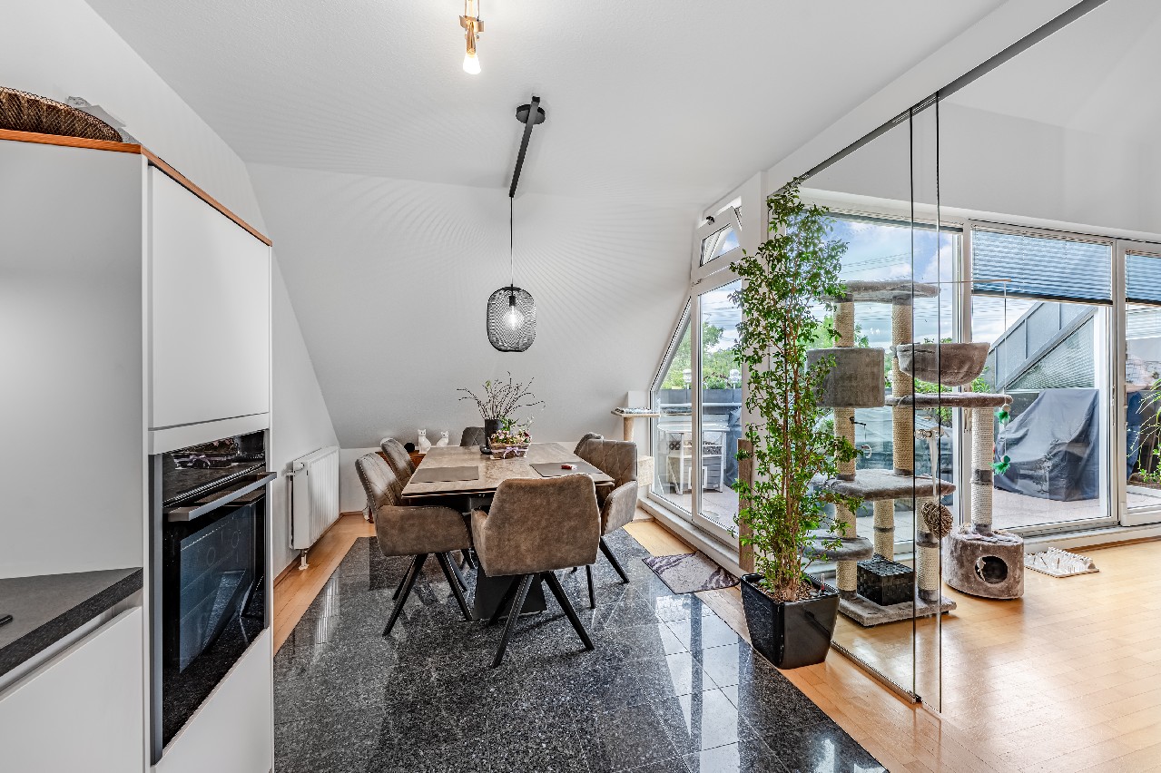 • Diese Maisonette-Wohnung erstreckt sich über das 2. Obergeschoss sowie das ausgebaute Galeriegeschoss einer gepflegten Wohnanlage am Rande eines Naturschutzgebiets. Mit einer Wohnfläche von ca. 107 m², zwei Balkonen, einer beeindruckenden Raumhöhe durch die offene Galerie und einer hochwertigen Ausstattung bietet diese Immobilie außergewöhnlichen Wohnkomfort – sowohl für Kapitalanleger als auch für Eigennutzer mit Anspruch. Der Zugang zur Wohnung erfolgt über das 2. Obergeschoss. Hier eröffnet sich ein großzügiger Wohnbereich mit Zugang zum großen Balkon in Westausrichtung. Über ein großes Schiebetürelement gelangen Sie ins Freie. Die Küche und der Essplatz sind durch eine elegante Glasschiebetür vom Wohnraum separiert. Die moderne Einbauküche wurde erst im vergangenen Jahr von