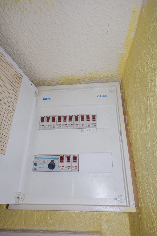 Elektroverteilung: Mit Kippsicherungen und FI- Schutzschalter, EG (ca. 1990) OG/DG (2022)