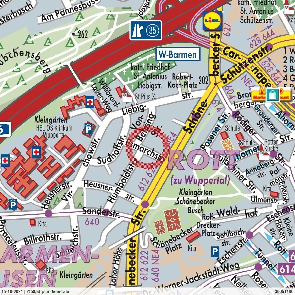• Wuppertal ist mit ca. 354.000 Einwohnern die größte Stadt des Bergischen Landes. Die Mehrfamilienhäuser liegen in einer Seitenstraße (30er Zone) im Stadtteil Barmen und wurden in geschlossener Bauweise errichtet. Die Einrichtungen des täglichen Bedarfs sind zum großen Teil in fußläufiger Entfernung zu erreichen. Mehrere Discounter (ALDI, NETTO), eine Bäckerei, Paketshop, Imbissbude befinden sich im nahen Umfeld. Ebenso eine Kindertagesstätte und eine Grundschule. Das Helios Klinikum befindet sich in unmittelbarer Entfernung. Für sportliche und freizeitliche Aktivitäten bieten sich die nahegelegene, ca. 22 km lange Nordbahntrasse und der Schönebecker Busch mit Kinderspielplatz an.
