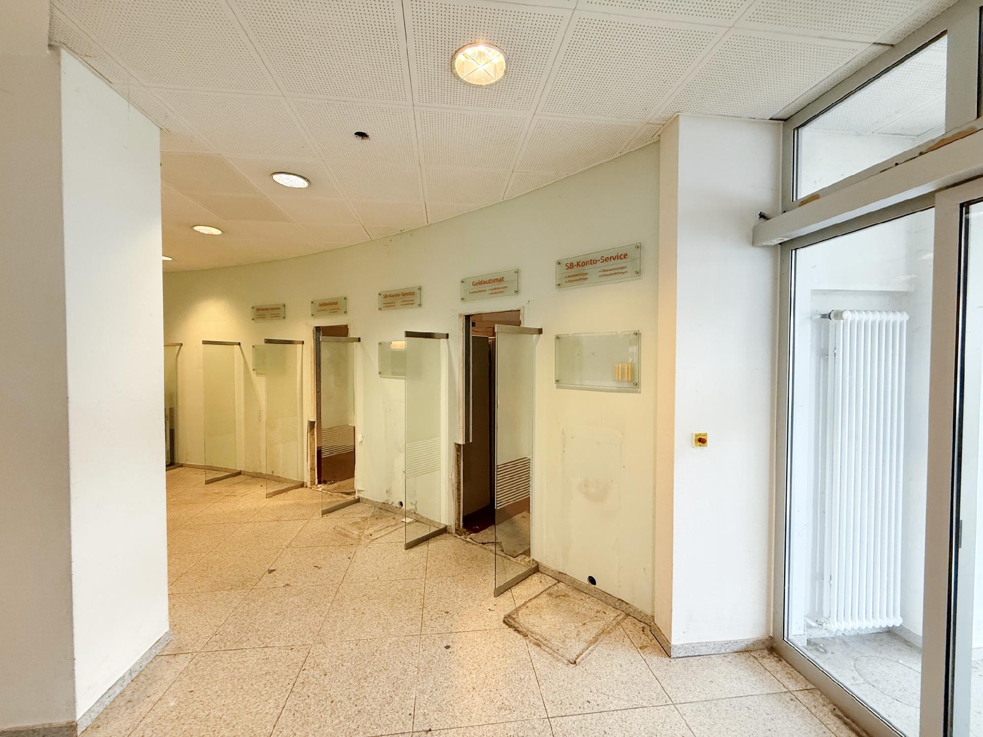 Diese großzügige, ehemals als Bankfiliale genutzte Einheit umfasst rund 440 m² und überzeugt mit einer klaren, kundenorientierten Raumstruktur. Der helle, nahezu ebenerdige Eingangsbereich öffnet sich zu einer weitläufigen Kundenhalle mit markantem Empfangs-/Schalterbereich und mehreren verglasten Beratungsboxen, die Diskretion bieten und zugleich Transparenz schaffen. Robuste Stein- bzw. Feinsteinböden im Publikumsbereich, roter textiler Belag in den Büros sowie abgehängte Lochrasterdecken mit integrierten Einbauleuchten und sichtbaren Auslässen der Raumlufttechnik prägen den professionellen Gesamteindruck. Rückwärtig gliedert sich die Fläche in funktionale Back-Office-Zonen, ruhige Einzel- und Teamräume, Besprechungszimmer sowie Archiv- und Technikflächen; eine interne Treppe bindet zusätzliche Nebenbereiche an und sorgt für kurze Wege im Arbeitsalltag. Die Sanitärbereiche sind hell gefliest, teilweise tagesbelichtet und getrennt angeordnet. Großzügige Fensterfronten bringen viel Tageslicht in die Räume, klassische Heizkörper sorgen für eine zuverlässige Beheizung. Frühere SB-Zonen der Bank etwa Konto-/Servicebereiche sind noch vorhanden und lassen sich je nach Bedarf weiterverwenden oder zurückbauen. Insgesamt präsentiert sich das Objekt in solidem, stellenweise modernisierungsbedürftigem Zustand und bietet damit hervorragende Voraussetzungen für eine zügige Inbetriebnahme bei gleichzeitig hoher Gestaltungsfreiheit. Ob Beratung, Kanzlei, Agentur, Praxis/Therapie, Bildung oder Showroom mit Empfang die überwiegend leichten Trennwände und die großzügigen Sichtachsen erlauben flexible Umbauten bis hin zu offenen Teamflächen oder zusätzlichen Meeting- und Schulungsräumen. Eine repräsentative Adresse mit viel Potenzial für moderne Dienstleistungs- und Büronutzungen.