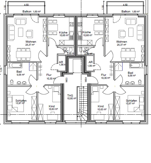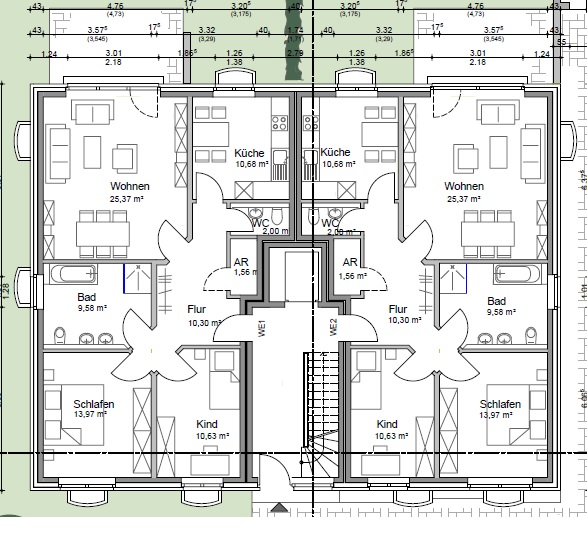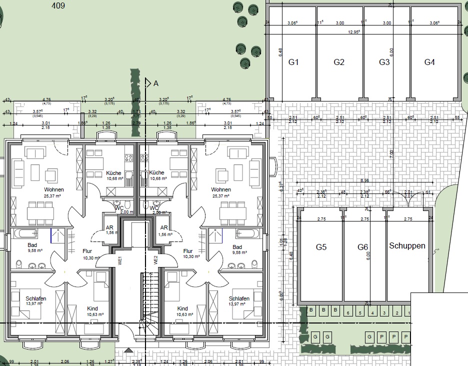 • Gebaut wird hier ein 6 Familienhaus mit Vollkeller und 6 Garagen. Die zwei Wohnungen im EG sind mit je 84,10m², die beiden Wohnungen im ersten OG sind mit je ca. 85,79 m² Wohnfläche geplant. Die beiden Wohnungen im DG sind je mit ca. 67,21m² geplant. Alle Wohnungen sind derzeit mit drei Zimmern, Vollbad und Balkon bzw. Terrasse im EG geplant. Somit ergibt sich eine gute Vermarktungsmöglichkeit bei der Vermietung. Es wird ein Vollkeller errichtet in dem die Haustechnik eingebaut wird. Des Weiteren sind hier 6 Mieterkeller ein Wasch- und ein Trockenbereich für die Wäsche eingeplant. Das Gebäude wird über eine Luftwärmepumpe beheizt. Die Außenanlage wird als Grünanlage fertiggestellt.