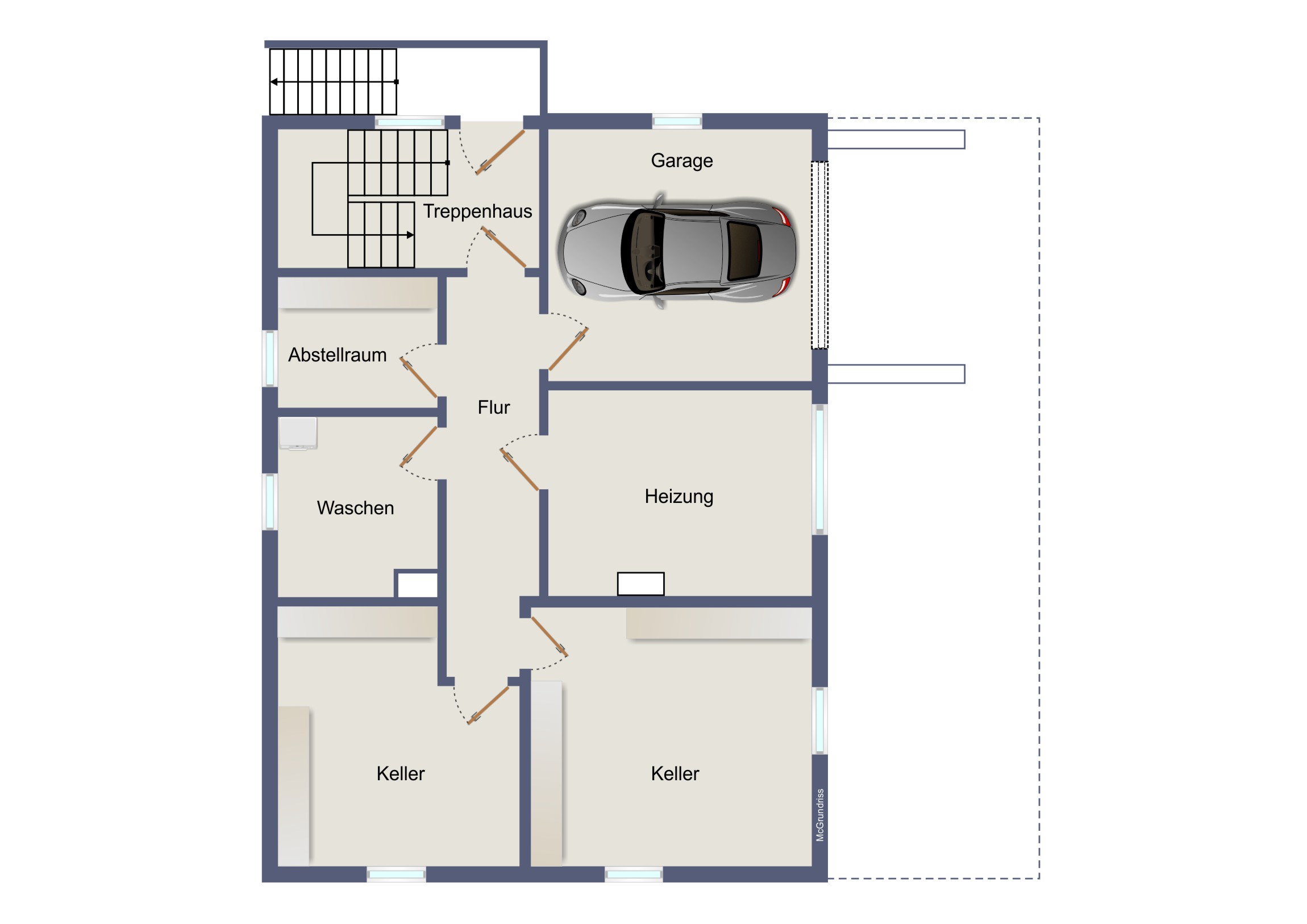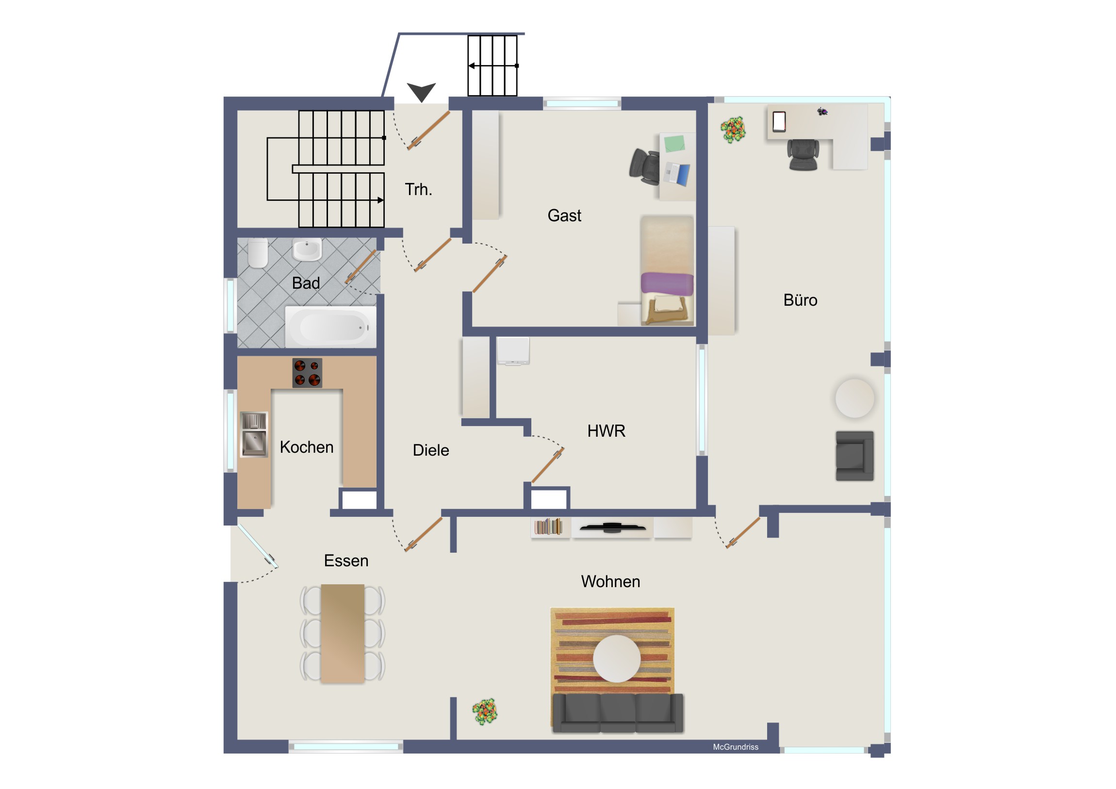 Erdgeschoss: 4 Zimmer, Küche, Diele, Bad/WC und Wintergarten. Obergeschoss: 4 Zimmer, Küche, Diele, Bad/WC und Wintergarten. Spitzboden ausbaufähig. Voll unterkellert. Garage.