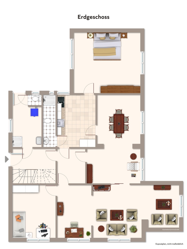 Im Erdgeschoss verfügen Sie über 2 Schlaf- bzw. Arbeitszimmer, eine Küche mit moderner Einbauküche und einem umfassend sanierten Bad.