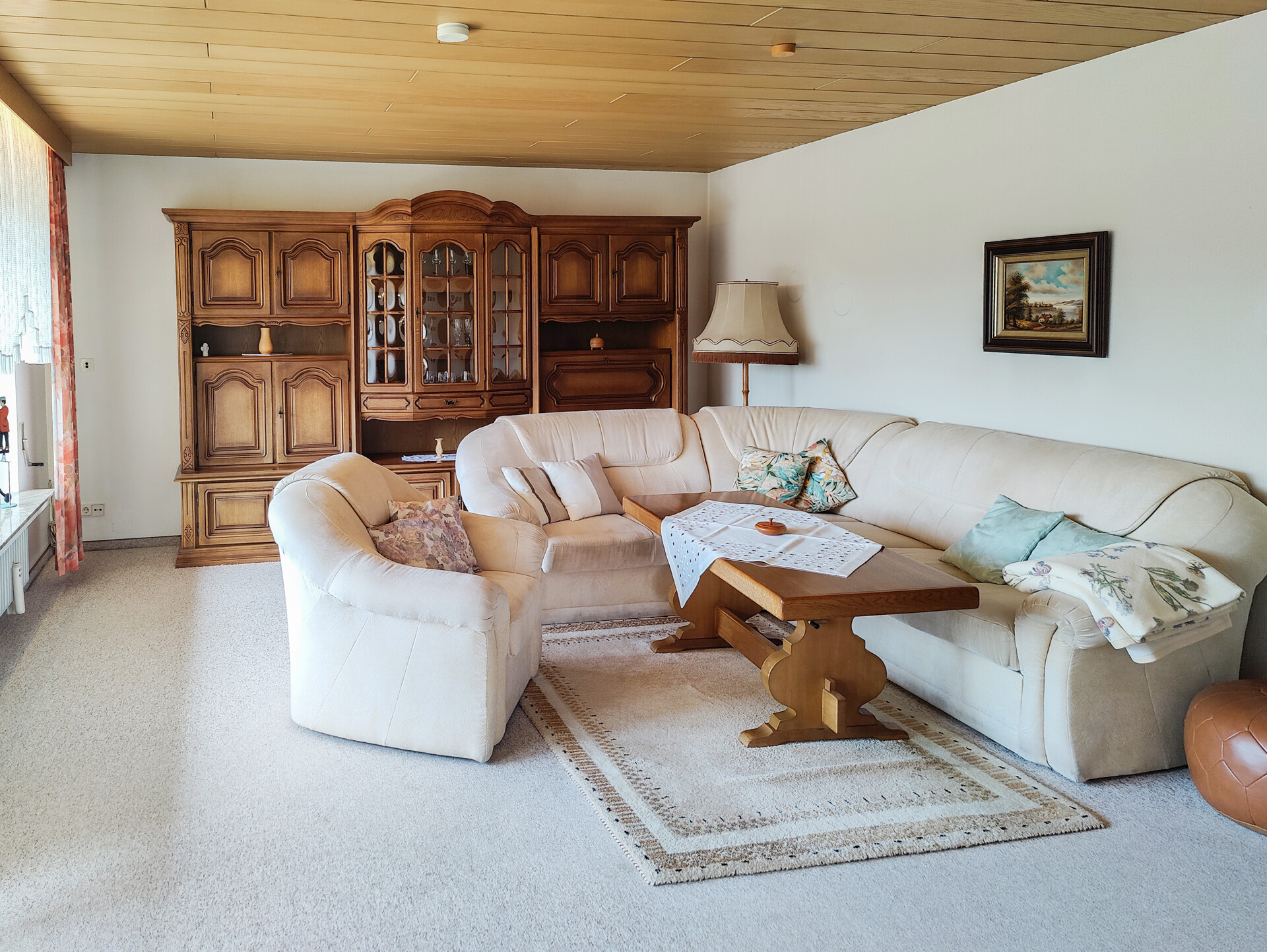 • Das gepflegte Einfamilienhaus mit Einliegerwohnung und angrenzender Garage wurde in den 1970er-Jahren in solider Massivbauweise errichtet. Die ca. 70 m² große Einliegerwohnung befindet sich im Souterrain und verfügt über eine vorgelagerte Terrasse, die direkt vom Wohnzimmer aus zugänglich ist. Der Zugang erfolgt über einen separaten, ebenerdigen Eingang, wodurch die Wohnung vollkommen eigenständig nutzbar ist. Aktuell ist sie lediglich durch eine verriegelte Tür von der Hauptwohnung getrennt und kann bei Bedarf problemlos in diese integriert werden. Aktuell ist sie an einen zuverlässigen Mieter für mtl. rund € 400,- € KM vermietet. Die Hauptwohnung erstreckt sich über das Erdgeschoss und bietet auf einer Ebene eine Wohnfläche von ca. 130 m². Vom großzügigen Wohnzimmer aus gelangen Sie auf einen weitläufigen Balkon mit Treppenabgang in den Garten. Über das zentrale Treppenhaus erreicht man zudem den Kellerbereich mit weiteren Abstellmöglichkeiten sowie der Heizungsanlage.