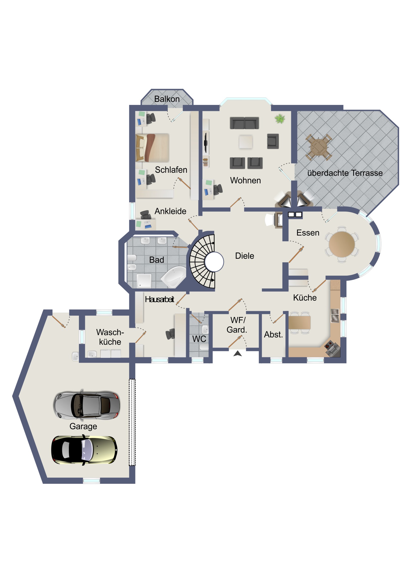 6 Zimmer, Ankleide, Küche, Windfang, 2 Dielen, 4 x Bad/WC, Gäste-WC, Hauswirtschaftsraum mit Waschküche, Abstellraum, Sauna, überdachte Terrasse, Keller und großzügige Doppelgarage für 2 Autos.