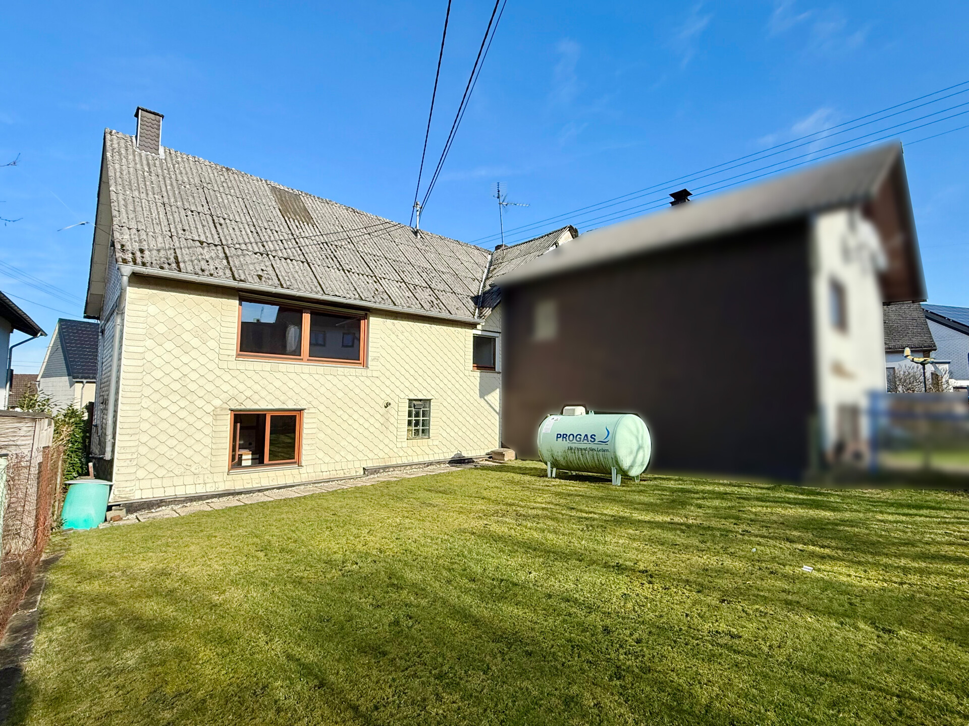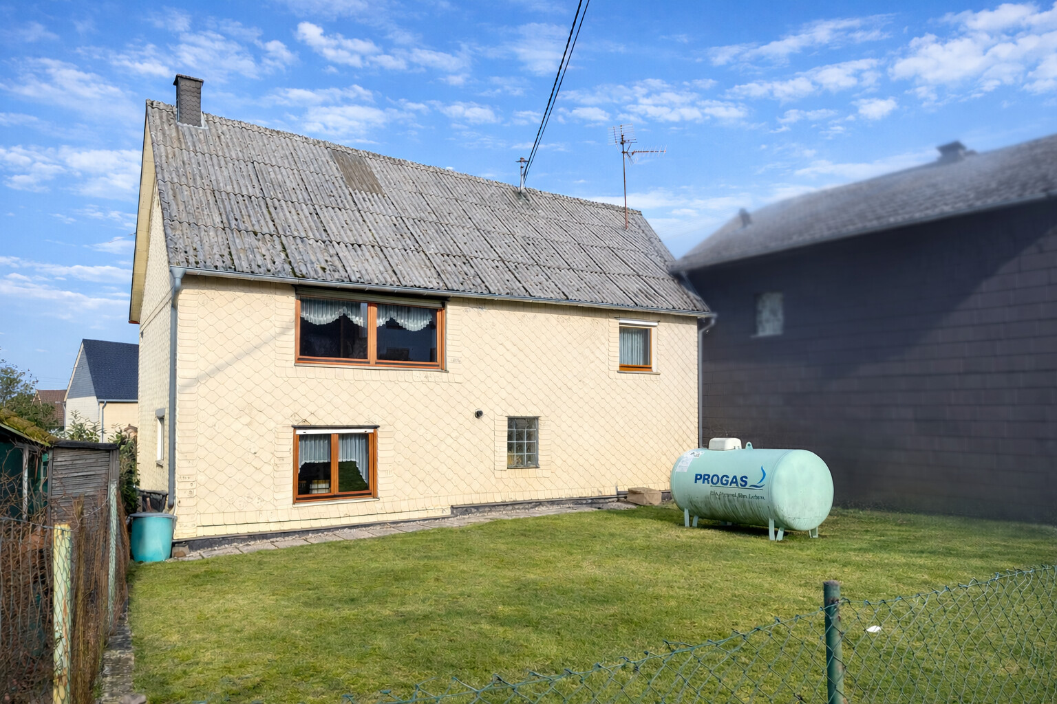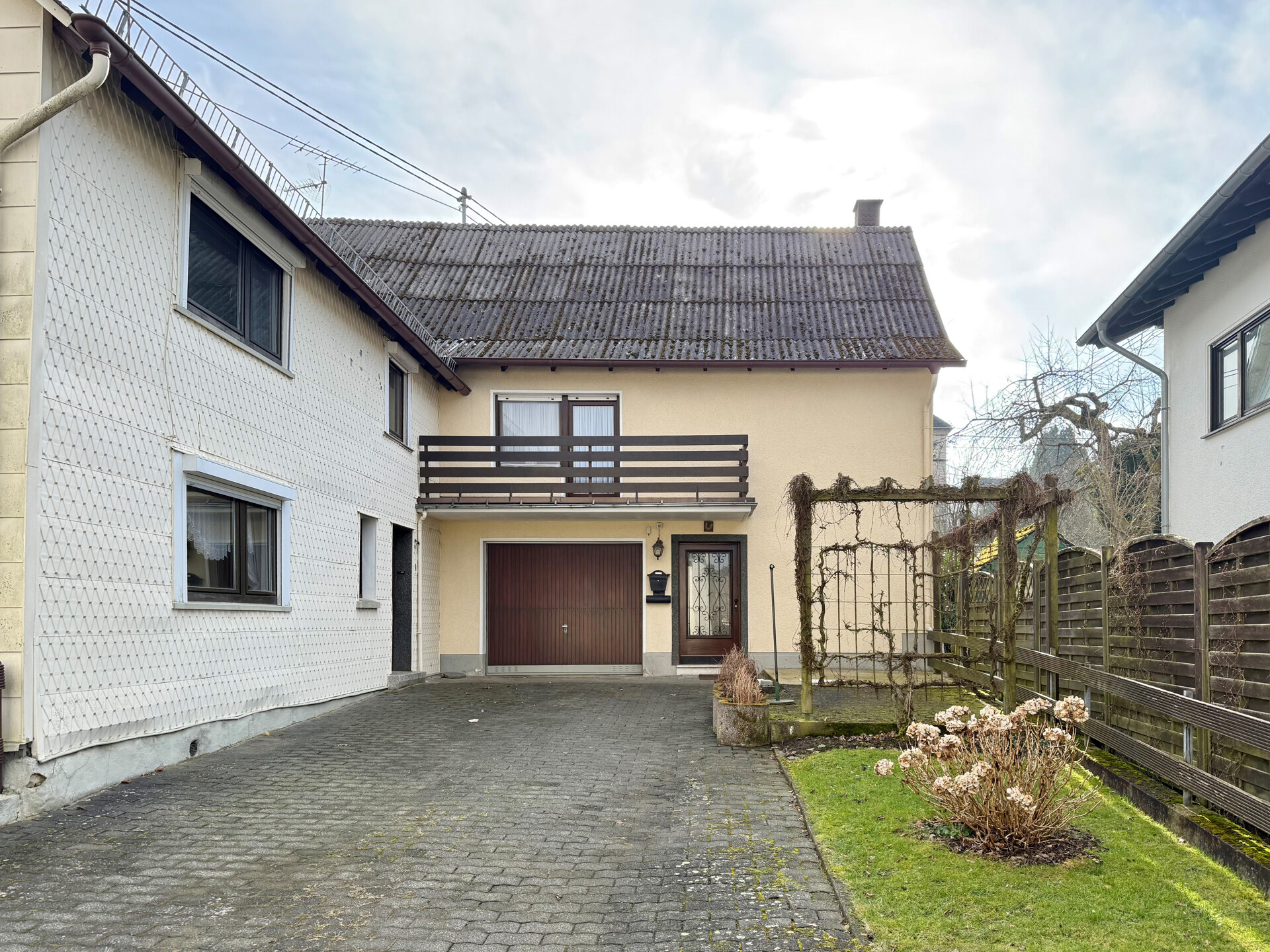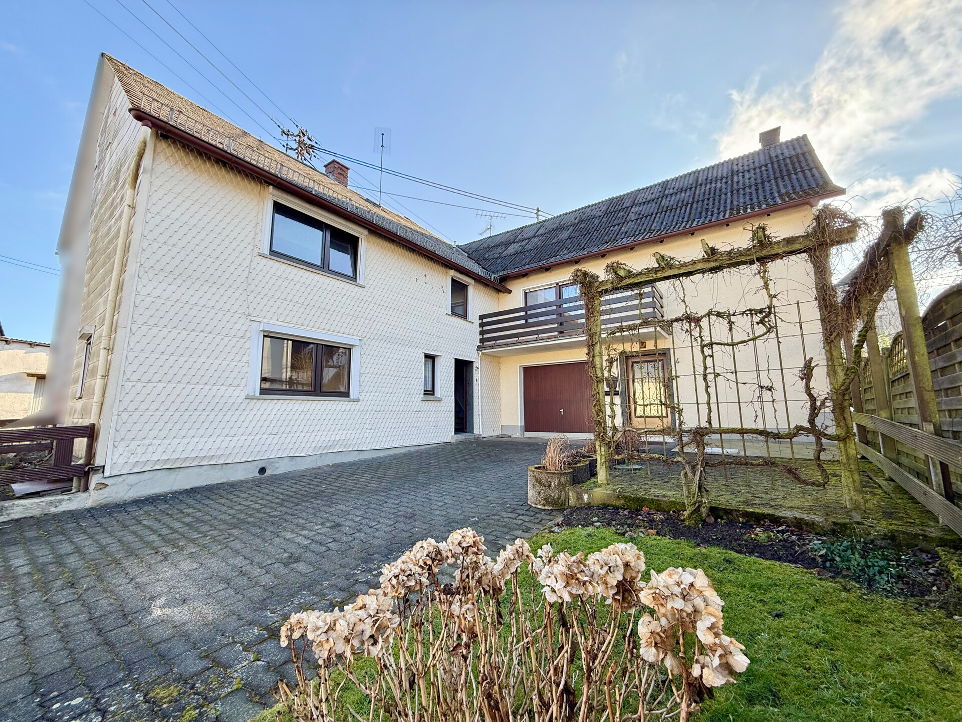 • Dieses Angebot umfasst ein Wohnhaus aus ca. 1900 sowie ein ehem. Nebengebäude, das um 1970 zu Wohnraum umgebaut wurde. Beide Gebäude stehen auf einem ca. 382 m² großen Grundstück und könne wieder verbunden werden, wodurch flexible Möglichkeiten entstehen. Der linke, ältere Teil erstreckt sich über 2 Etagen. Im EG befinden sich der Eingangsbereich mit ehemaligen Küchenanschlüssen, ein Wohnzimmer, ein Hauswirtschaftsraum sowie das frühere Bad. Über eine Luke im Eingangsbereich ist ein Erdkellerraum zugänglich. Im OG liegen ein Durchgangszimmer und ein Schlafzimmer, der Dachboden ist über eine Treppe erreichbar. Die Deckenhöhen sind überwiegend niedrig (ca. 1,91–2,06 m, Balken noch niedriger). Eine frühere Verbindung zum zweiten Haustrakt im OG wurde verschlossen, kann jedoch wieder geöffnet werden. Der rechte, jüngere Gebäudeteil verfügt ebenfalls über 2 Etagen. Im EG befinden sich ein Duschbad und die Küche. Das OG bietet ein großes Wohnzimmer, ein Schlafzimmer mit Anschlussmöglichkeit zum Altbau sowie ein Kinderzimmer mit Balkon. Der Dachboden dient als Stauraum. Ein Kellerraum wird als Werkstatt genutzt. Im hinteren Grundstücksbereich befindet sich ein Garten mit Gastank zur Beheizung des neueren Hausteils, der derzeit nur über den Außenbereich erreichbar ist.