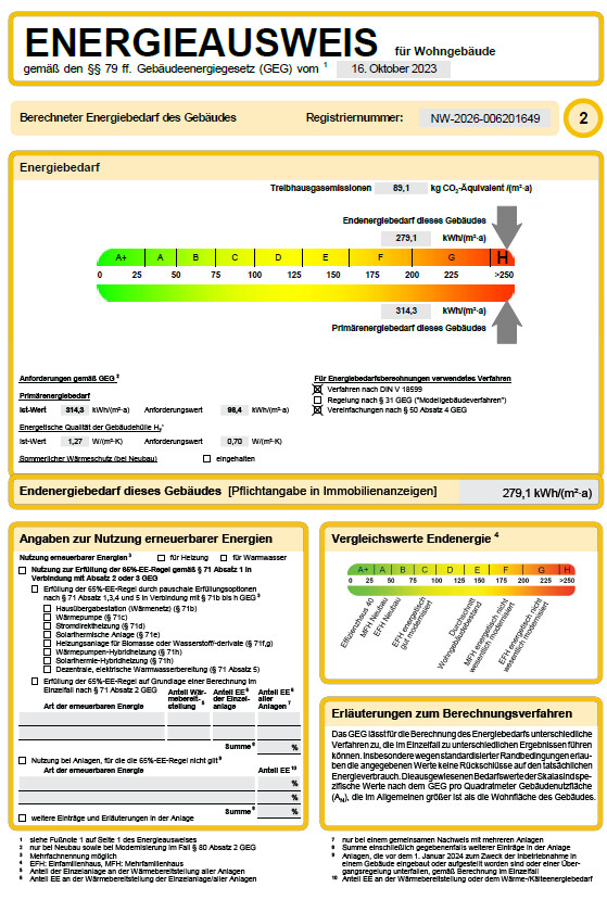- Endenergiebedarf: 279,10 kWh/(m²*a)