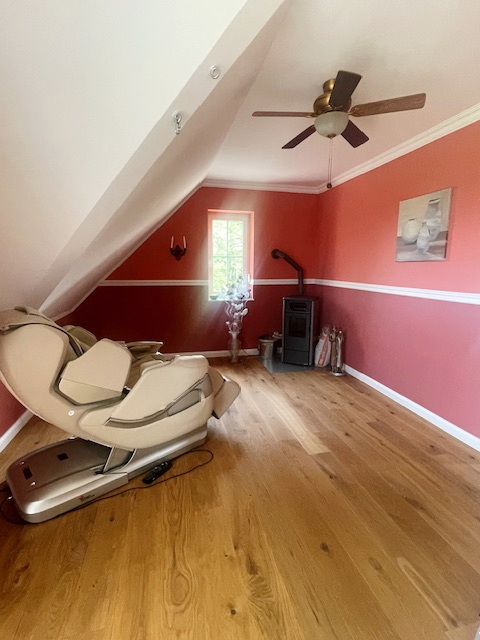 Auf der ersten Etage befinden sich drei Zimmer, die Ihnen vielfältige Nutzungsmöglichkeiten bieten. Ob als Schlafzimmer, Büro oder Gäste-Zimmer – hier ist für jeden etwas dabei. Besonders hervorzuheben ist ein Zimmer im oberen Geschoss, das mit einem Pelletofen und einem Balkon ausgestattet ist. Hier können Sie es sich, egal ob drinnen oder draußen, gemütlich machen und bei einem guten Buch oder Glas Wein entspannen.