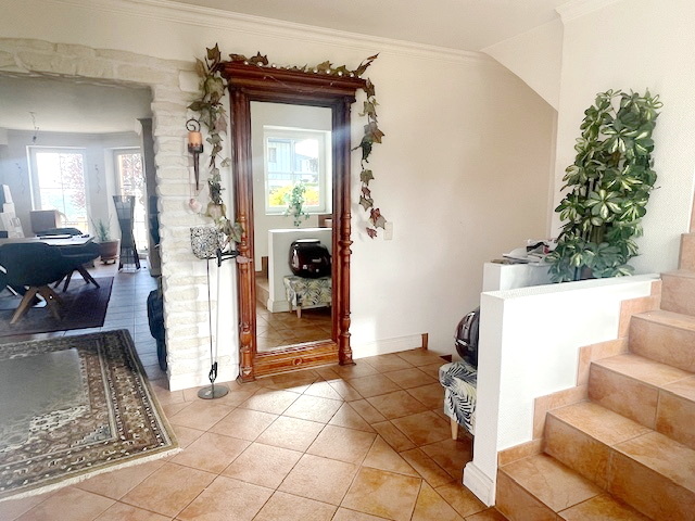 Bei Betreten des Hauses werden Sie von der großzügigen Eingangshalle empfangen, die Sie direkt in das Herzstück des Hauses führt – das Wohnzimmer. Hier erwartet Sie ein gemütlicher Kamin, der an kalten Winterabenden für wohlige Wärme sorgt.