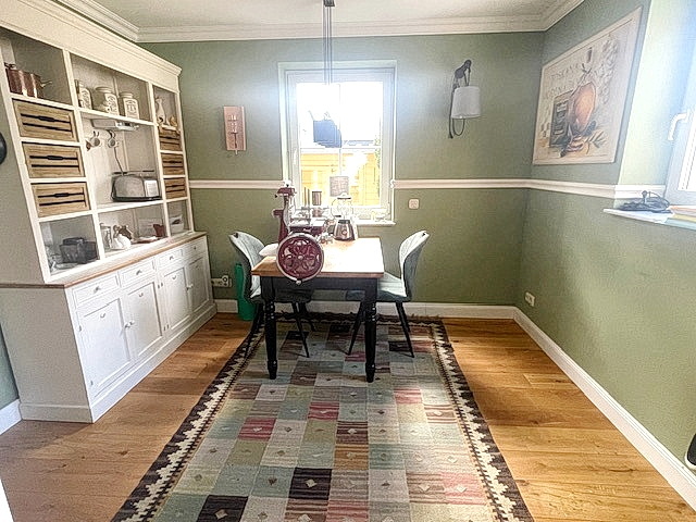 Der angrenzende Essbereich bietet ausreichend Platz für gemeinsame Mahlzeiten mit Familie und Freunden.