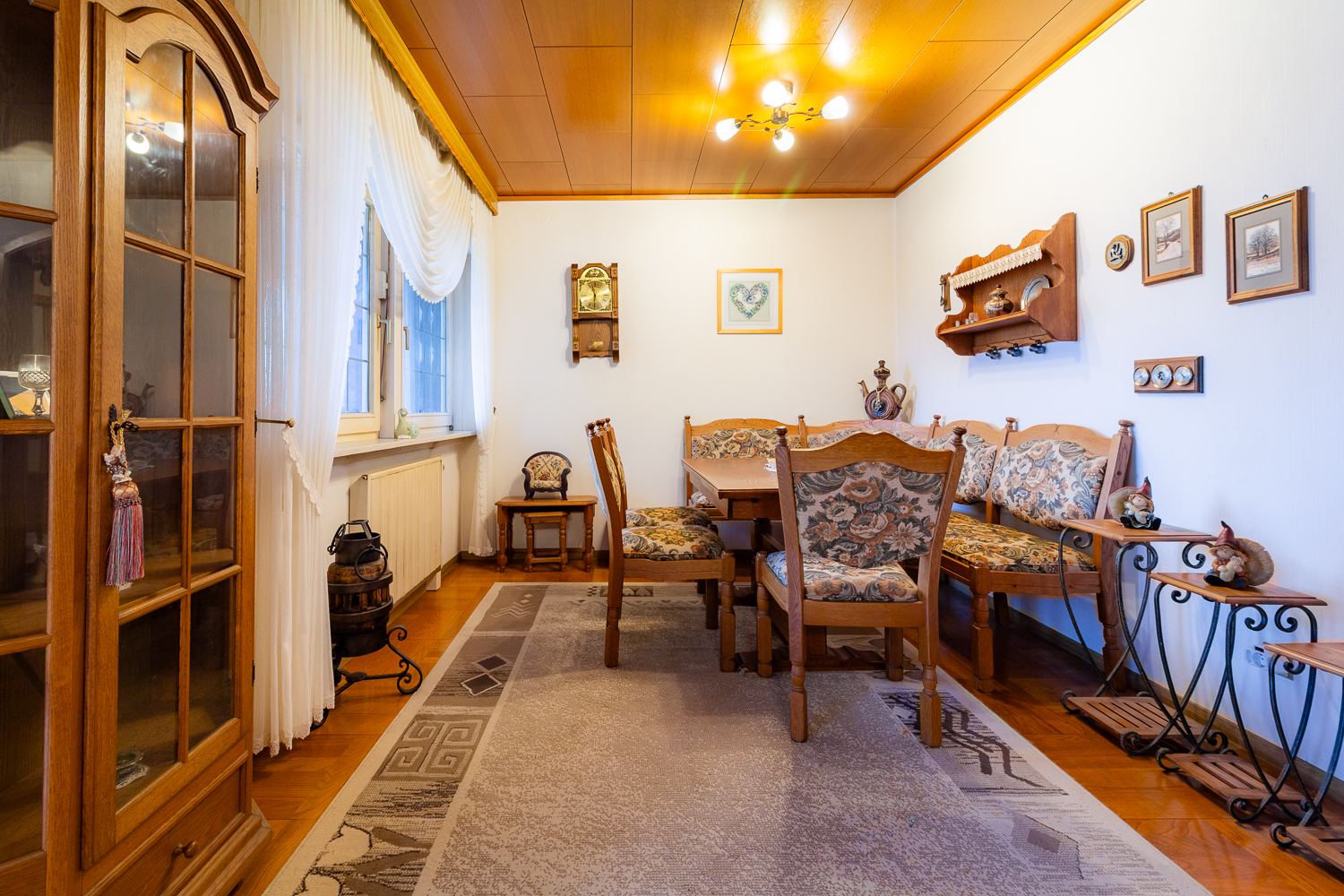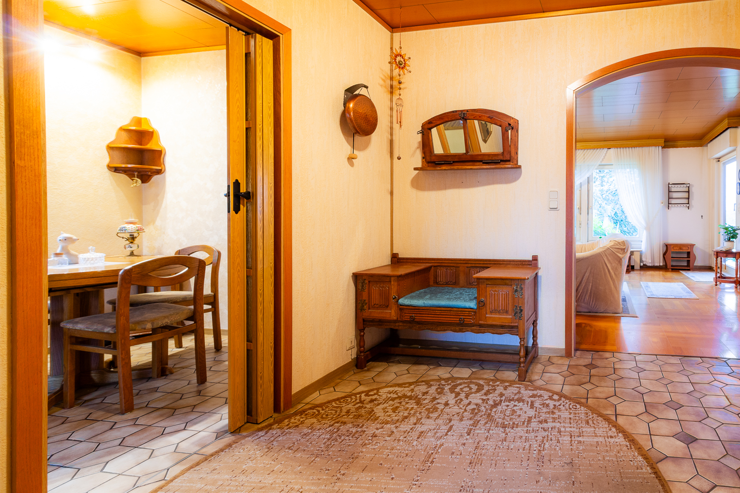 Von der Diele aus öffnet sich der geräumige Wohn- und Essbereich. Große Fensterflächen sorgen für reichlich Tageslicht und einen schönen Blick ins Grüne. Von hier aus gelangen Sie auch auf die teilüberdachte Terrasse – perfekt für den ersten Kaffee am Morgen, das Sonnenbaden am Mittag oder dem Entspannen am Abend. Aufgrund der vorhandenen Raumstruktur bietet sich die Umgestaltung zu einer offenen Wohnküche an: So kann ein moderner, offener Lebensmittelpunkt entstehen, in dem Kochen, Essen und Wohnen harmonisch ineinander übergehen.
