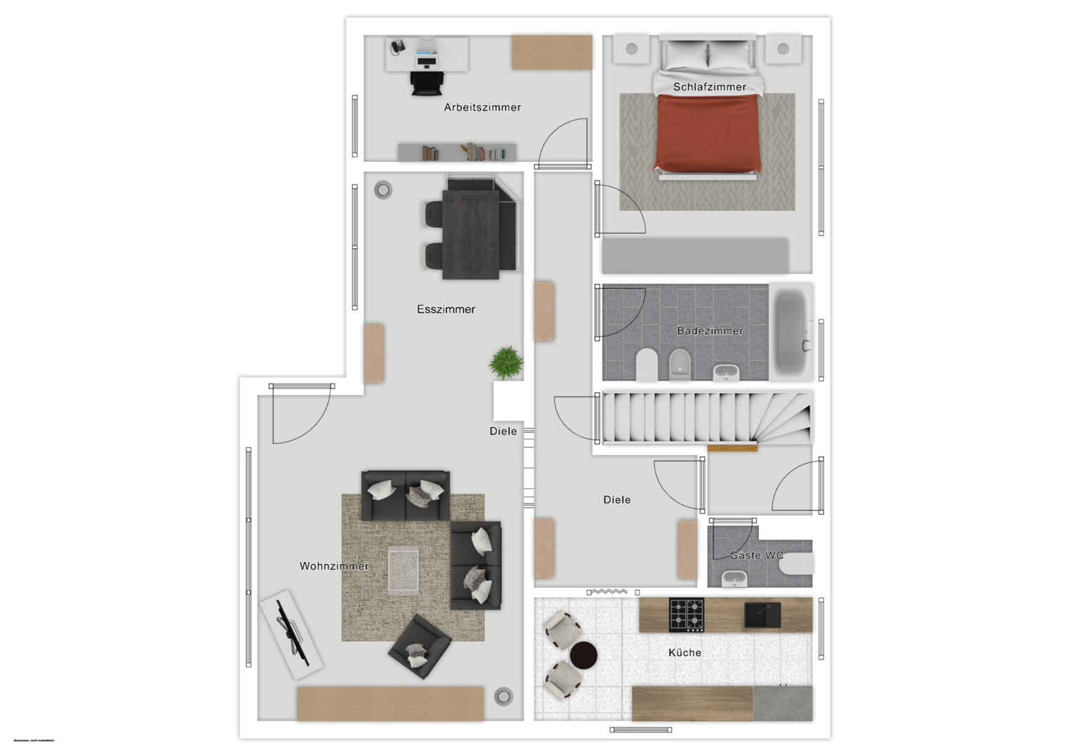 Beim Betreten des Hauses gelangen Sie durch den Windfang in eine großzügige Diele, die als zentraler Mittelpunkt dient. Im vorgelagerten Windfang finden Sie das Gäste-WC und die bereits vorhandene Treppe ins derzeit ungenutzte Dachgeschoss.