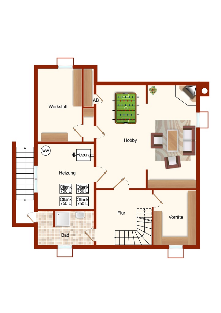 Das Haus ist voll unterkellert inkl. großem Hobbyraum mit Kamin u.v.m.; es ist sehr gepflegt, Haustür, Fenster, teilw. Holzdecken sowie Bad und WC sollten sie Ihrem Geschmack entsprechend erneuern – wir schätzen die Kosten auf ca. 80.000 EUR.
