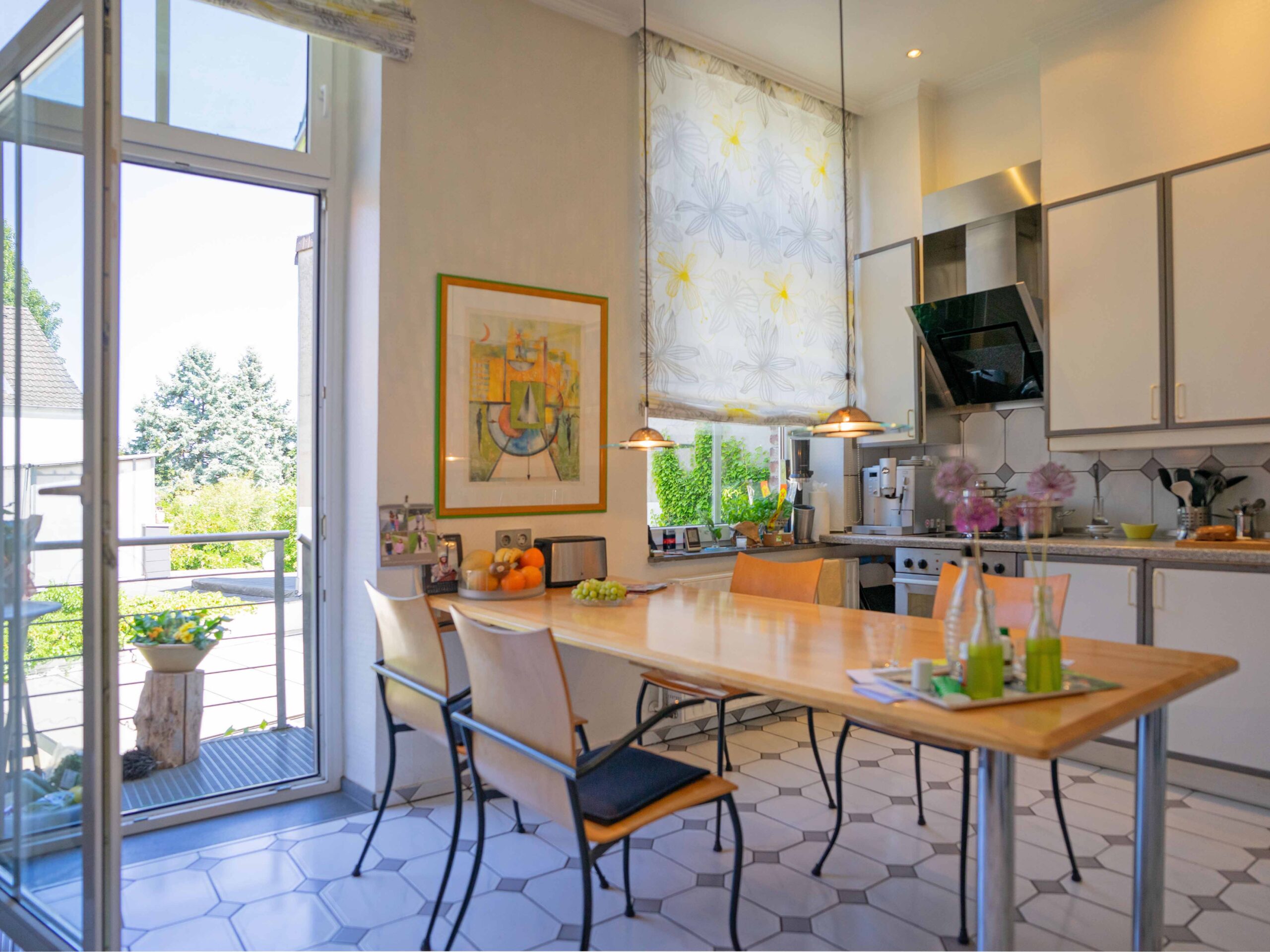 Die rund 175 m² große Wohnung im 1. Obergeschoss verfügt über 6 geräumige Zimmer – zum Teil Durchgangszimmer – eine schöne Küche, ein großes Bad mit Wanne, Dusche und Fenster, ein Gäste-WC und den Zugang in den gemütlich angelegten Garten mit überdachter Terrasse.