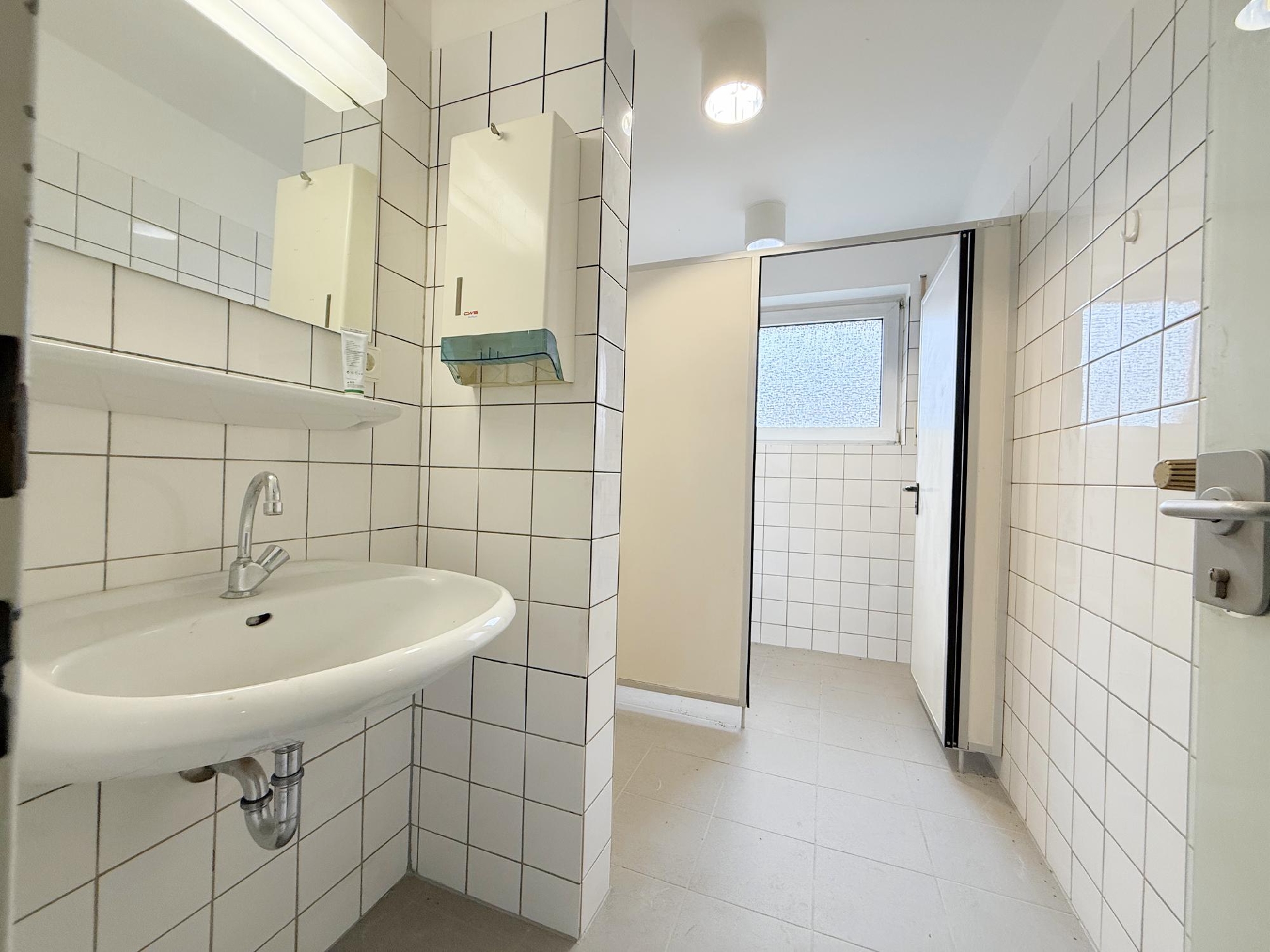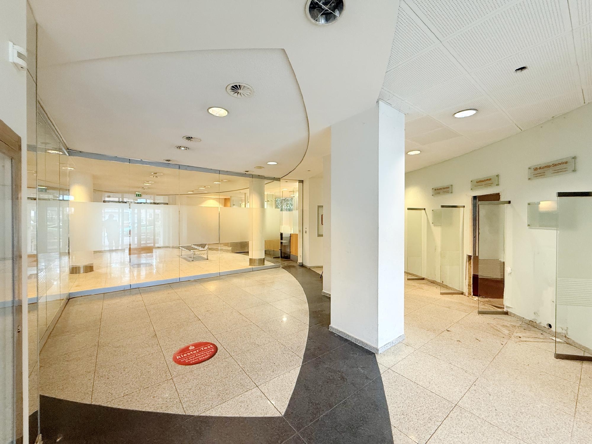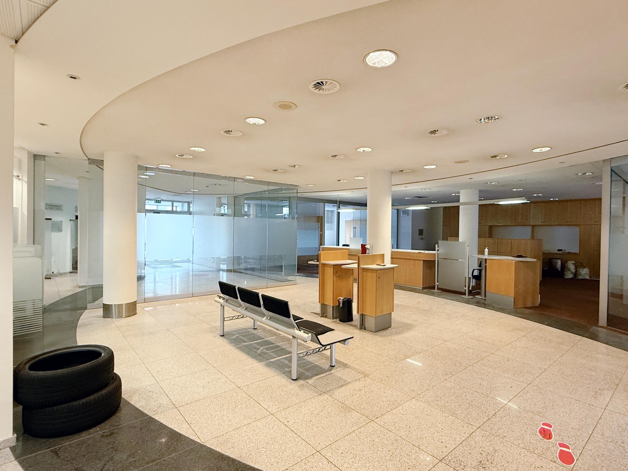 • Diese großzügige, ehemals als Bankfiliale genutzte Einheit umfasst rund 440 m² und überzeugt mit einer klaren, kundenorientierten Raumstruktur. Der helle, nahezu ebenerdige Eingangsbereich öffnet sich zu einer weitläufigen Kundenhalle mit markantem Empfangs-/Schalterbereich und mehreren verglasten Beratungsboxen, die Diskretion bieten und zugleich Transparenz schaffen. Robuste Stein- bzw. Feinsteinzeugböden im Publikumsbereich, roter textiler Belag in den Büros sowie abgehängte Lochrasterdecken mit integrierten Einbauleuchten und sichtbaren Auslässen der Raumlufttechnik prägen den professionellen Gesamteindruck. Rückwärtig gliedert sich die Fläche in funktionale Back-Office-Zonen, ruhige Einzel- und Teamräume, Besprechungszimmer sowie Archiv- und Technikflächen; eine interne Treppe bindet zusätzliche Nebenbereiche an und sorgt für kurze Wege im Arbeitsalltag. Die Sanitärbereiche sind hell gefliest, teilweise tagesbelichtet und getrennt angeordnet. Großzügige Fensterfronten bringen viel Tageslicht in die Räume, klassische Heizkörper sorgen für eine zuverlässige Beheizung. Frühere SB-Zonen der Bank – etwa Konto-/Servicebereiche – sind noch vorhanden und lassen sich je nach Bedarf weiterverwenden oder rückbauen. Insgesamt präsentiert sich das Objekt in solidem, stellenweise modernisierungsbedürftigem Zustand und bietet damit hervorragende Voraussetzungen für eine zügige Inbetriebnahme bei gleichzeitig hoher Gestaltungsfreiheit. Ob Beratung, Kanzlei, Agentur, Praxis/Therapie, Bildung oder Showroom mit Empfang – die überwiegend leichten Trennwände und die großzügigen Sichtachsen erlauben flexible Umbauten bis hin zu offenen Teamflächen oder zusätzlichen Meeting- und Schulungsräumen. Eine repräsentative Adresse mit viel Potenzial für moderne Dienstleistungs- und Büronutzungen.