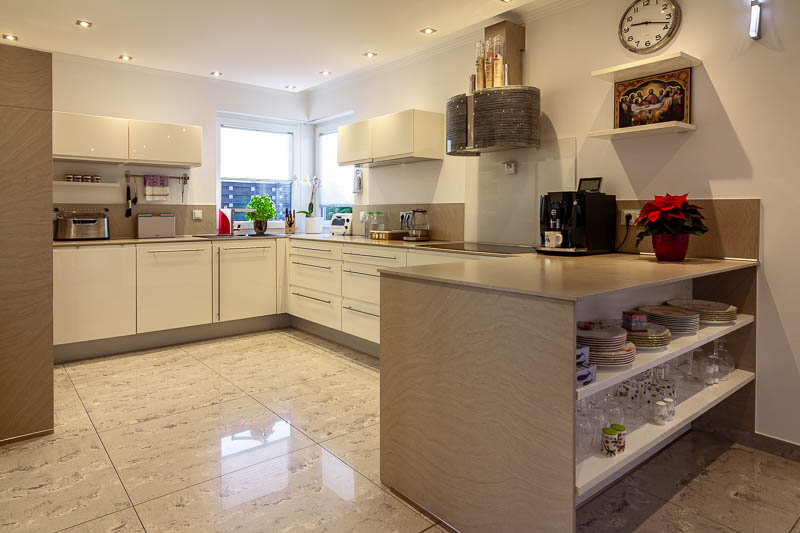 Abgeschlossen wird das Erdgeschoss durch die Küche, die zwar auch über den Flur erreichbar ist, sich aber auch dem Essbereich öffnet und dadurch eine wunderbare Ergänzung des beinahe loftartigen Grundrisses dieser Etage darstellt. Übrigens: sie ist auf Wunsch gratis zu übernehmen! Die herrlich, tief überdachte Terrasse, die sowohl vom Wohn- wie auch vom Essbereich erreichbar ist, bildet den Anfang Ihres Außenwohnzimmers, das Sie mit über 600 Quadratmetern Grundstück zukünftig vielseitig genießen können.