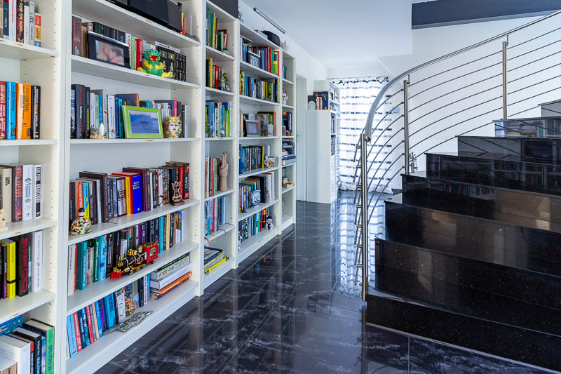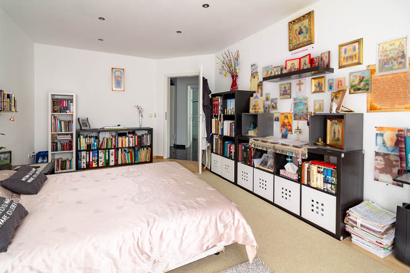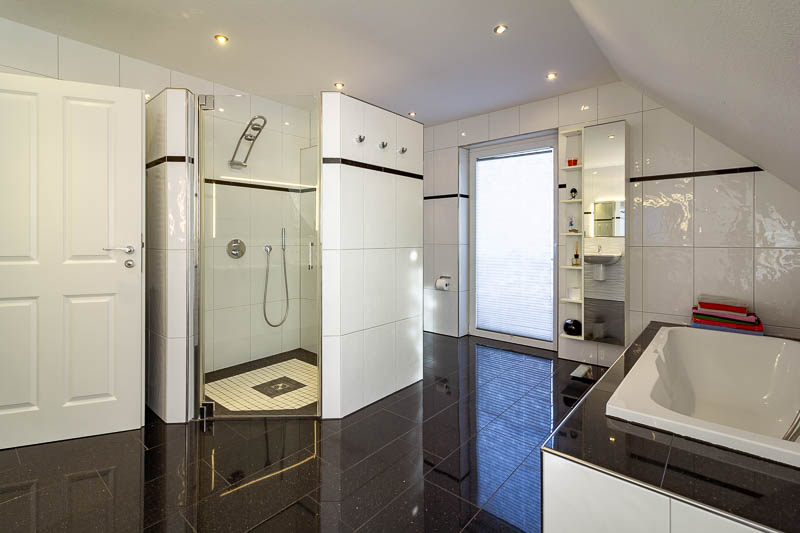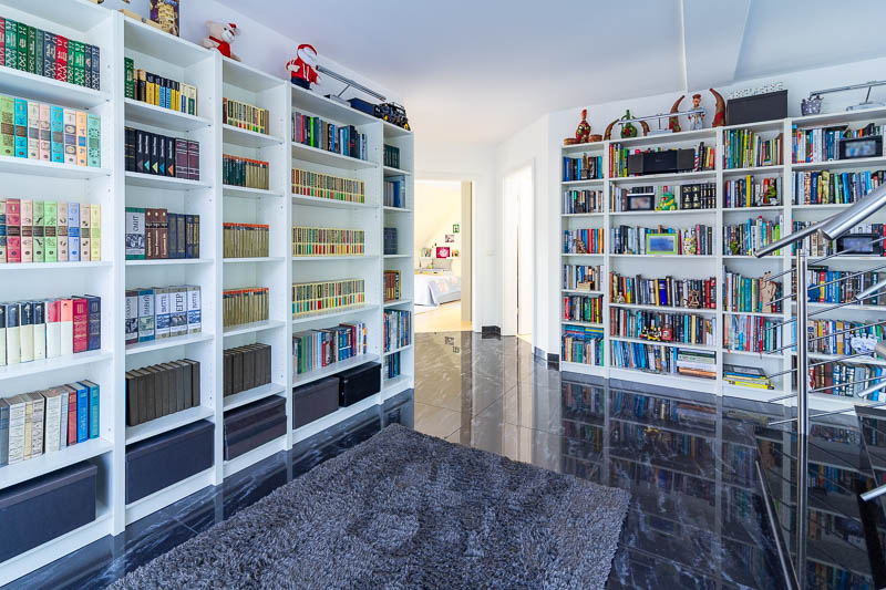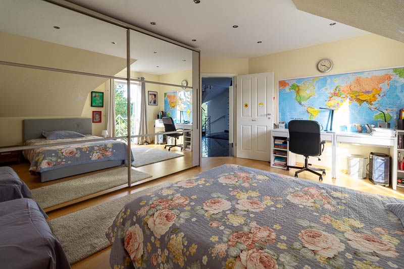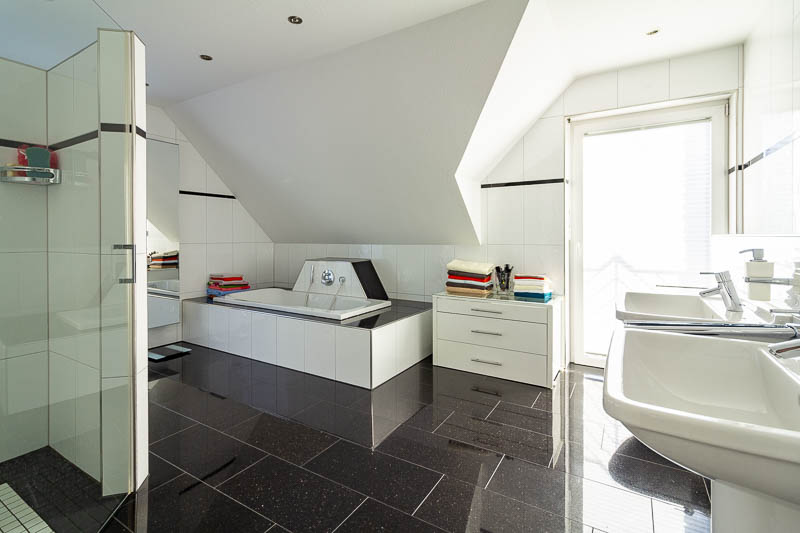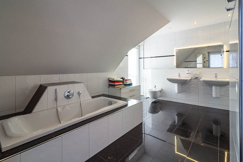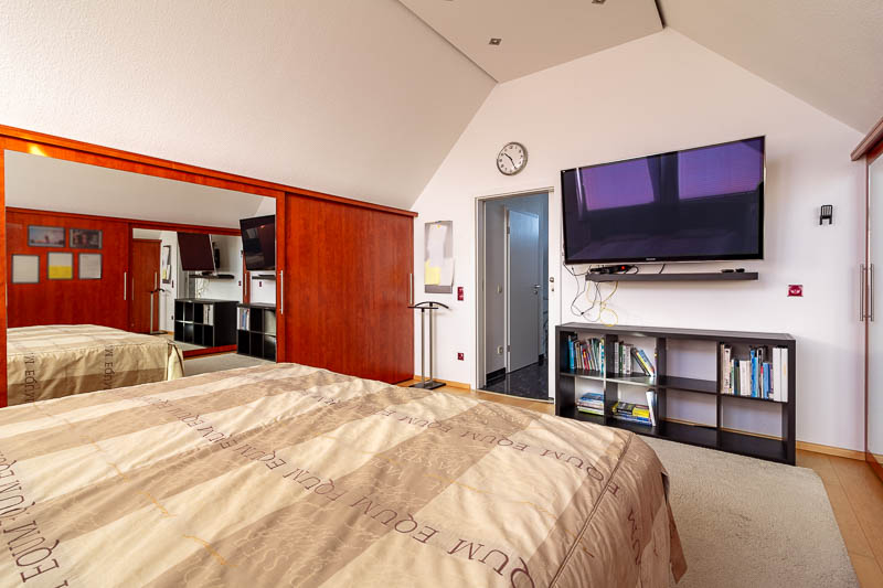 Über die Treppe flanieren Sie zunächst in die offen und hell gestaltete Galerie Ihrer Schlafetage, die Sie direkt mit einer herrlich großen Bibliothek begrüßt. Was für ein traumhafter Raum zum Lesen und Entspannen, von dem aus Sie sogar auf die schöne Loggia spazieren können! Wofür nutzen SIE ihn? Insgesamt drei großzügige Schlafräume bilden den Hauptteil dieser Etage, die im großzügigen und hochmodernen Familienbad mit ebenerdiger Dusche und Badewanne, umhüllt von wahnsinnig viel Platz, ihren Abschluss findet.