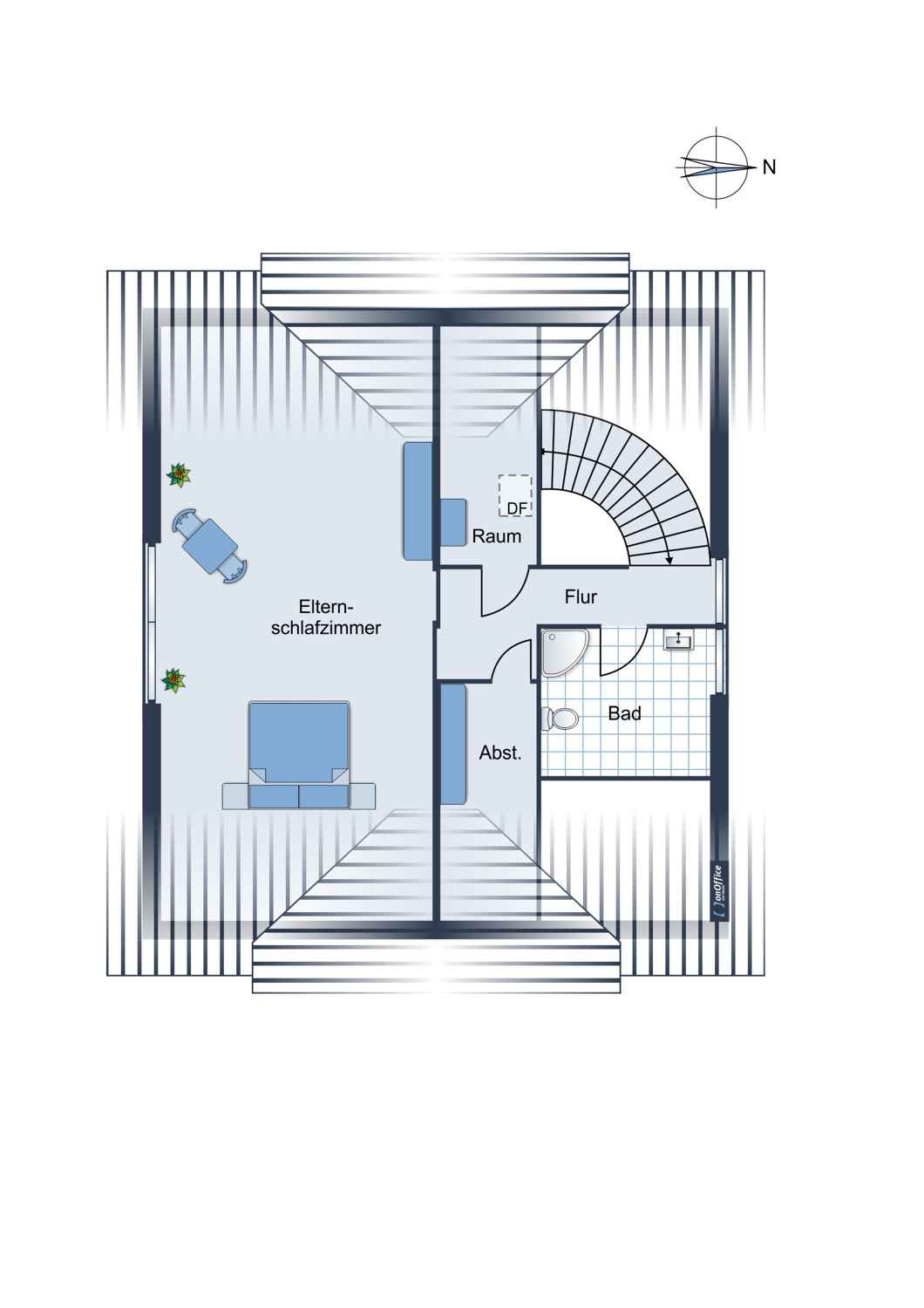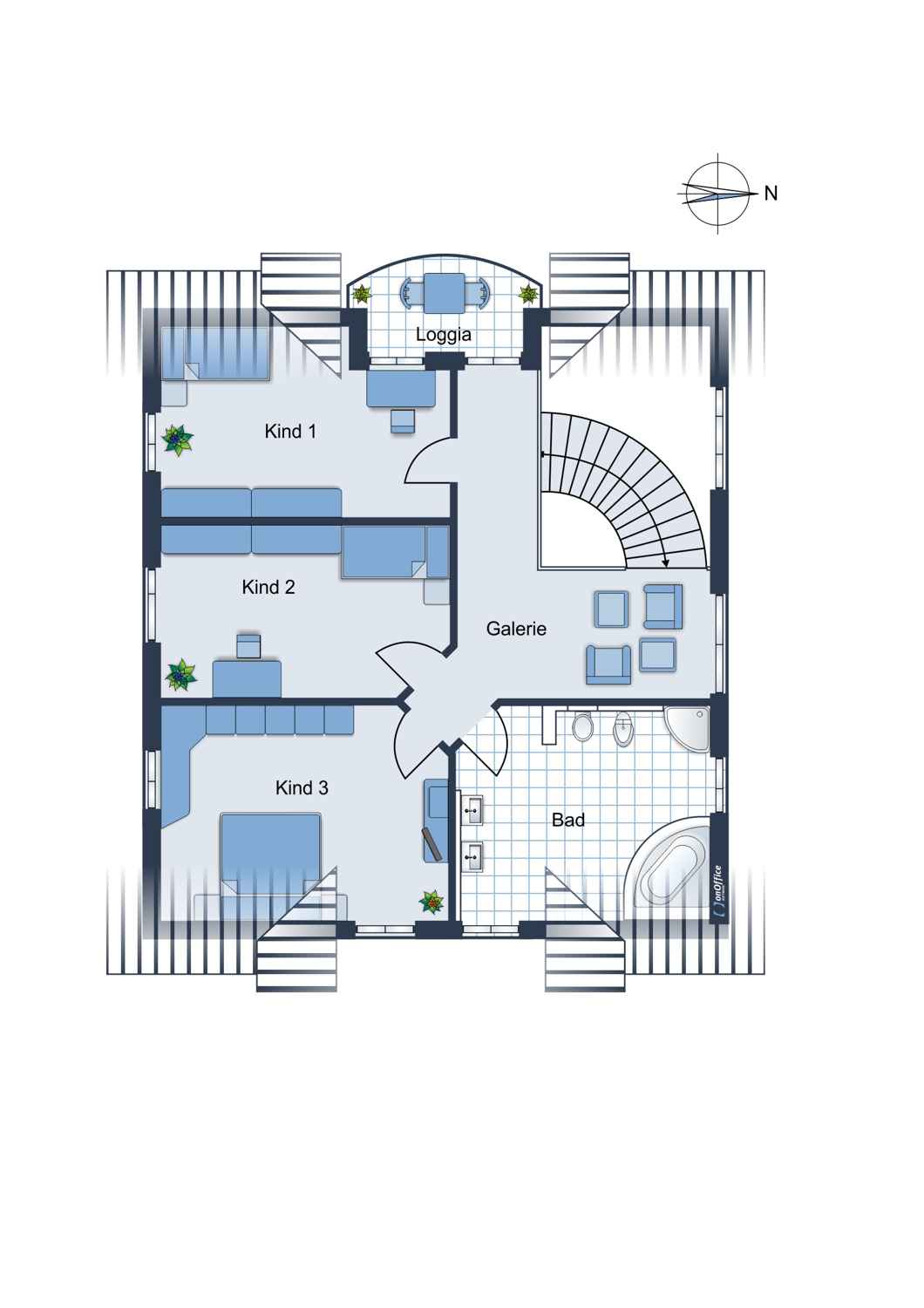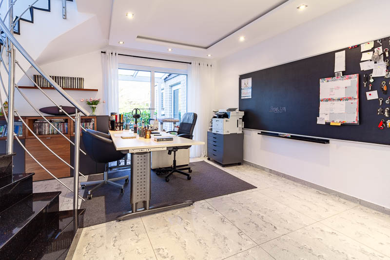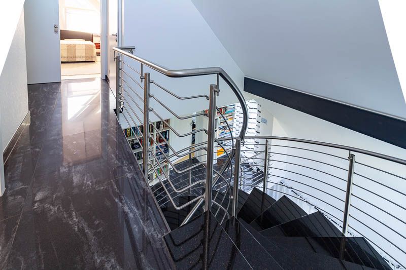 Über die Treppe flanieren Sie zunächst in die offen und hell gestaltete Galerie Ihrer Schlafetage, die Sie direkt mit einer herrlich großen Bibliothek begrüßt. Was für ein traumhafter Raum zum Lesen und Entspannen, von dem aus Sie sogar auf die schöne Loggia spazieren können! Wofür nutzen SIE ihn? Insgesamt drei großzügige Schlafräume bilden den Hauptteil dieser Etage, die im großzügigen und hochmodernen Familienbad mit ebenerdiger Dusche und Badewanne, umhüllt von wahnsinnig viel Platz, ihren Abschluss findet.