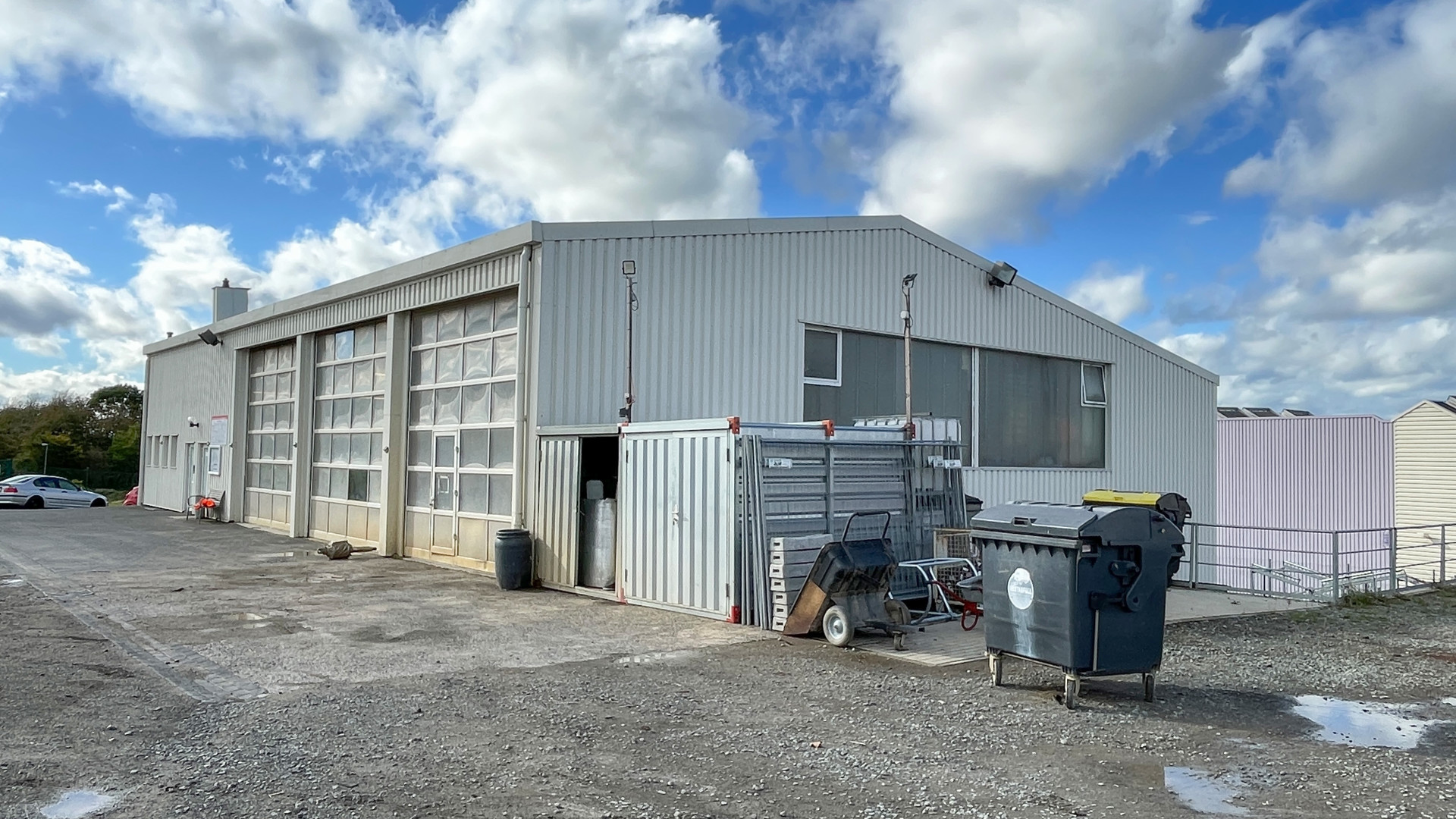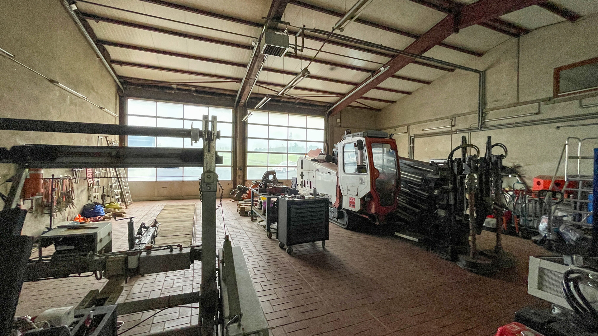 • Das Hauptgebäude wurde Anfang der 80er Jahre auf einem rund 8.540 m² großen Grundstück gebaut und bietet eine großzügige Bürofläche mit Werkstatt von ca. 528 m². 1987/1988 wurde das Objekt um eine Gerätehalle für den Fuhrpark mit einer Fläche von ca. 391 m² erweitert. Die Freifläche beträgt ca. 7.621 m².