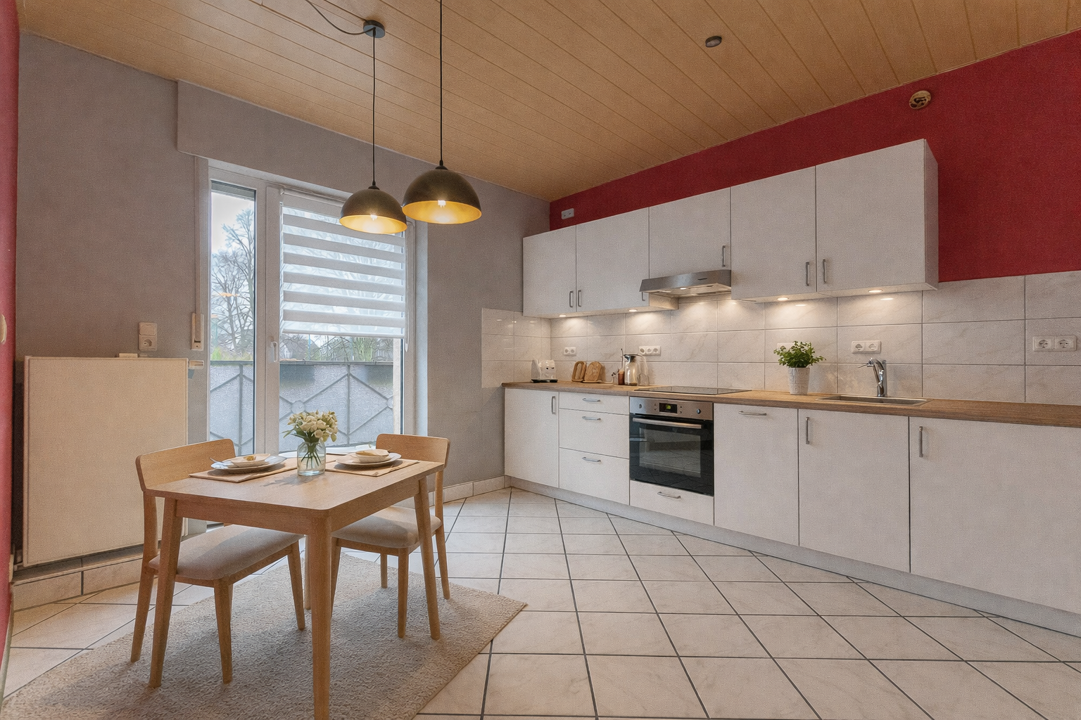 Rechts angrenzend liegt die geräumige Küche mit Platz für eine Küchenzeile sowie einen Essbereich. Von hier aus besteht Zugang zum Balkon mit Südausrichtung.