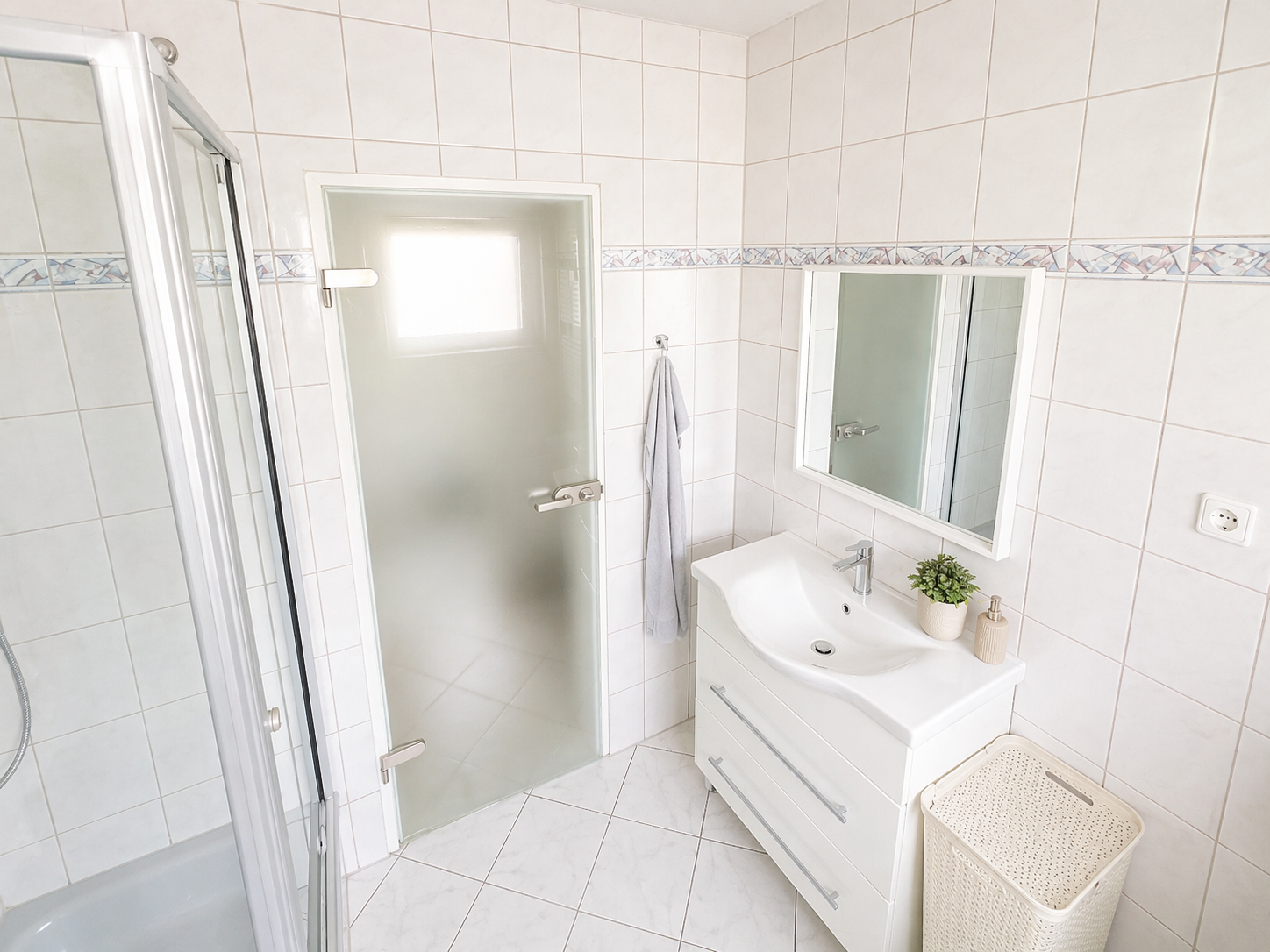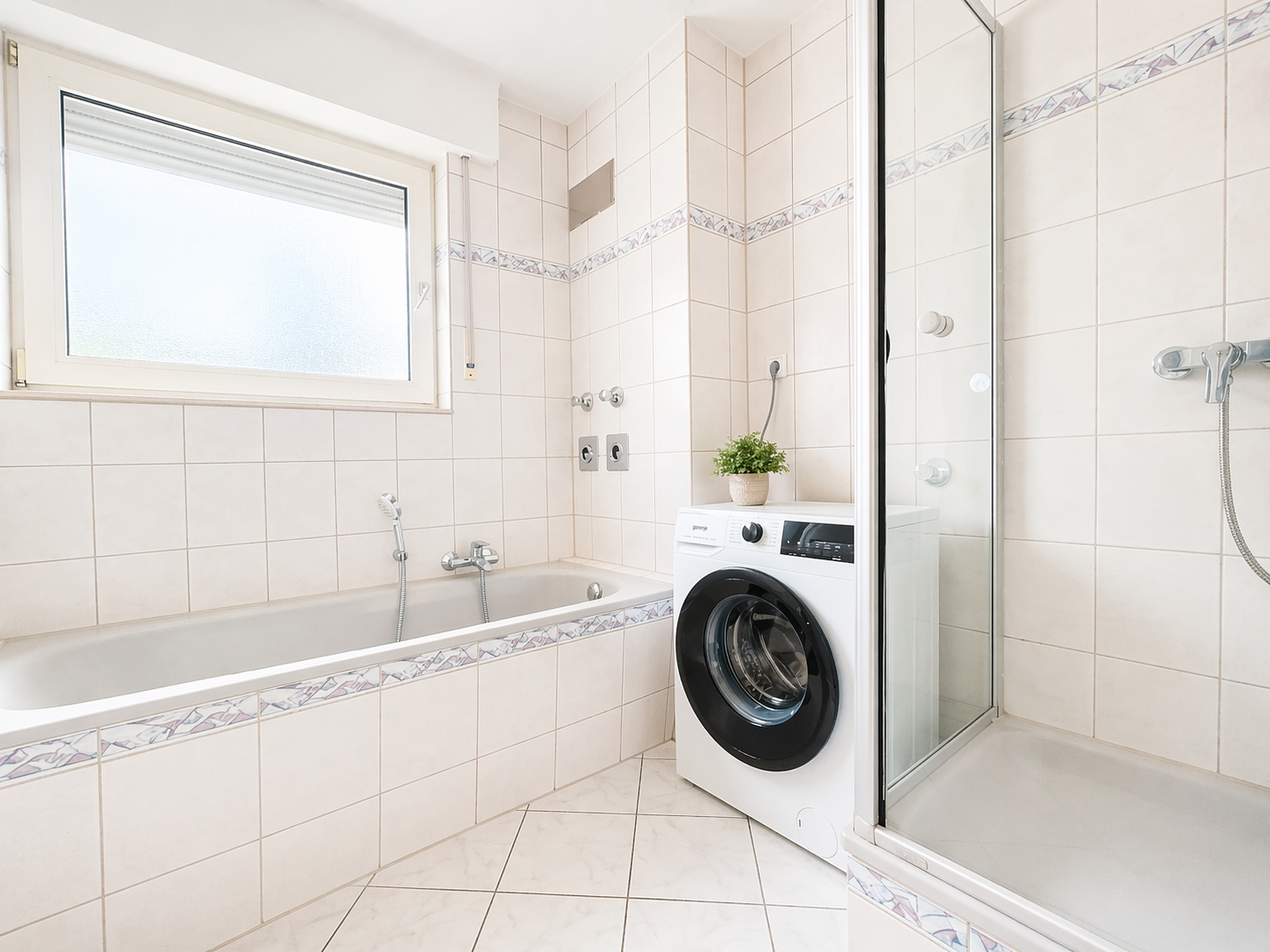 Badezimmer: Tageslichtbad mit Badewanne, Dusche, beheiztem Handtuchhalter und Waschmaschinenanschluss