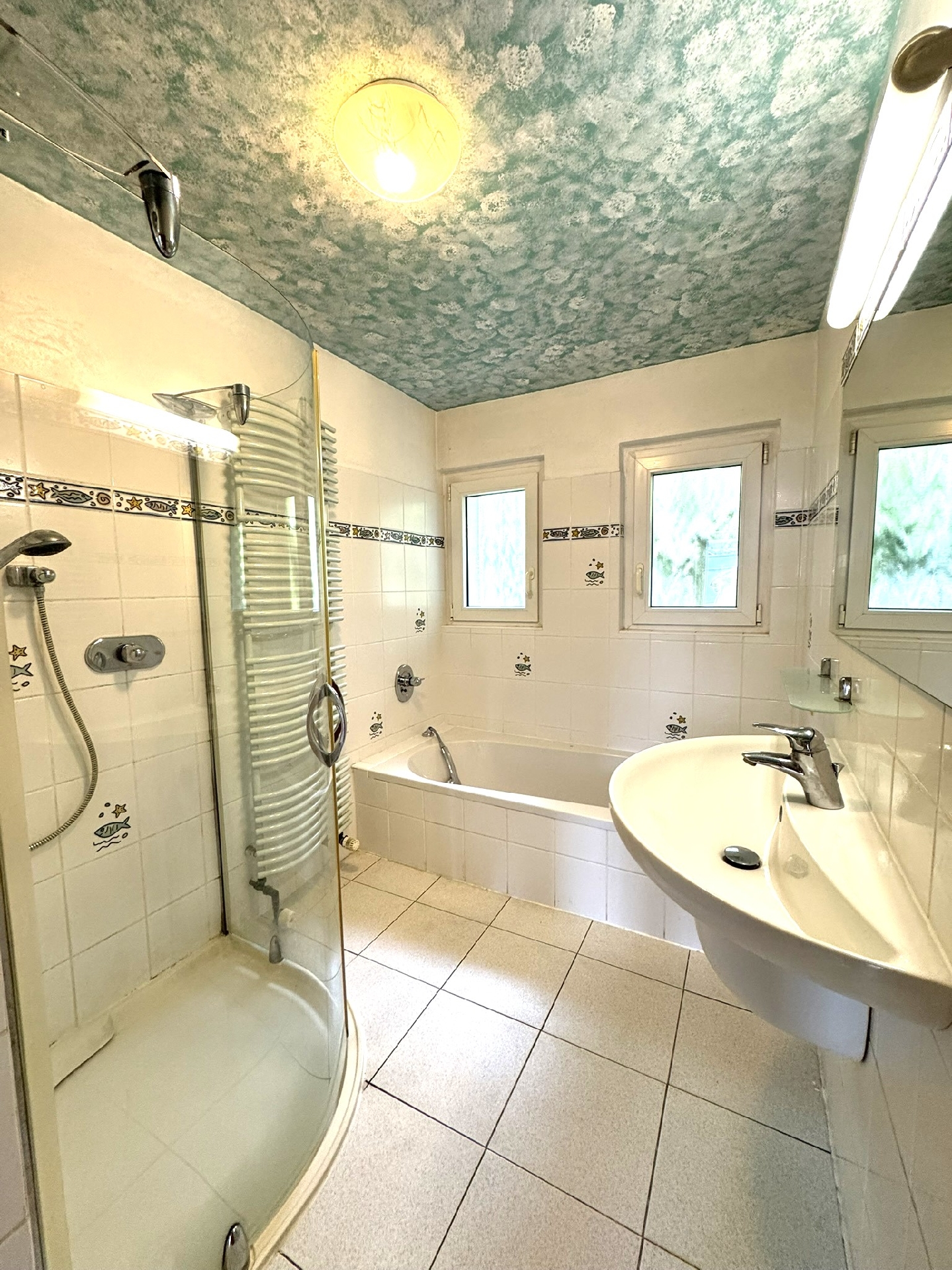 – hell gefliestes Tageslichtbad im Obergeschoss, ausgestattet mit Badewanne, Dusche, Waschtisch und WC