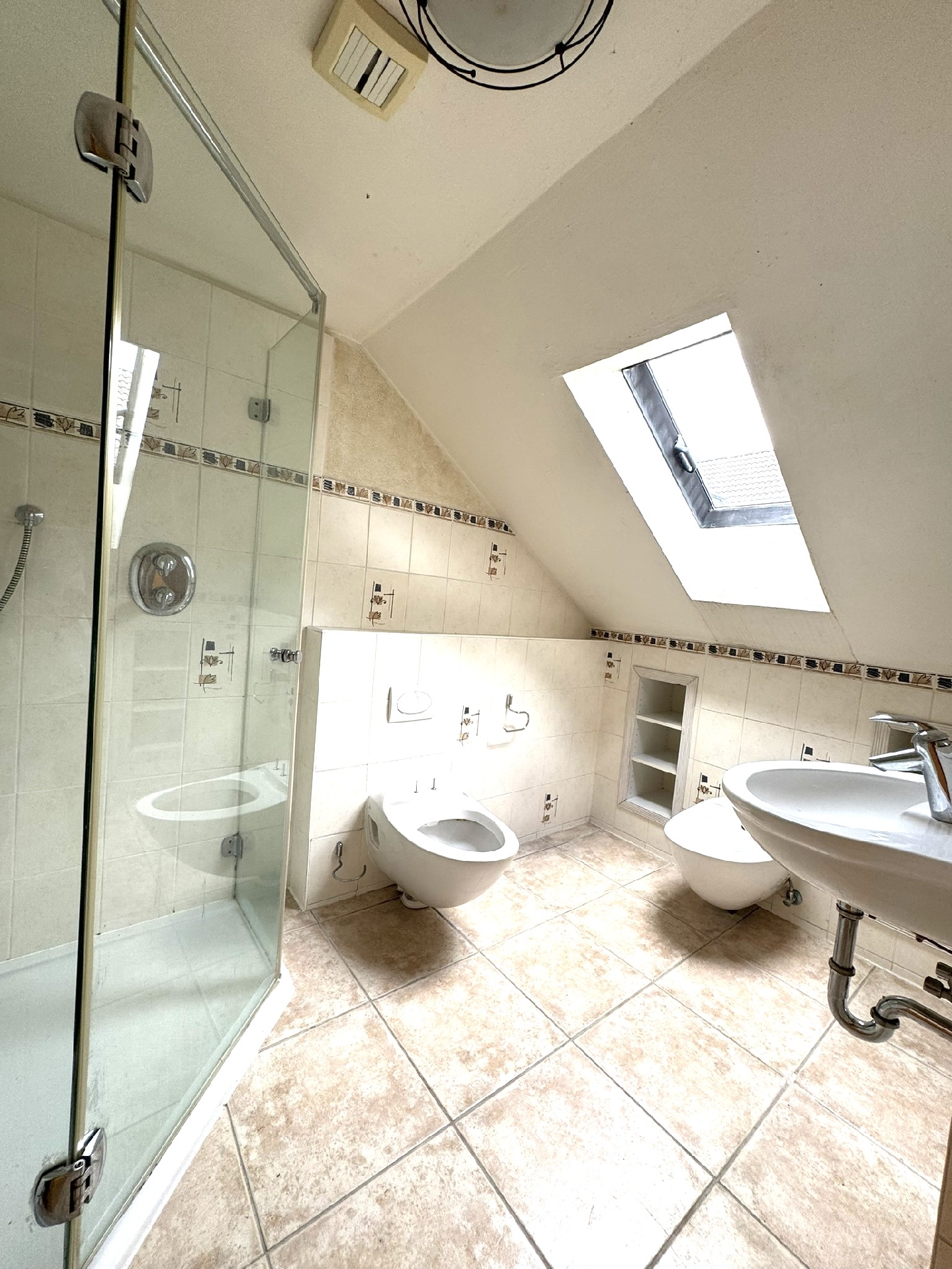 – hell gefliestes Tageslichtbad im Dachgeschoss, ausgestattet mit Dusche, Waschtisch und WC
