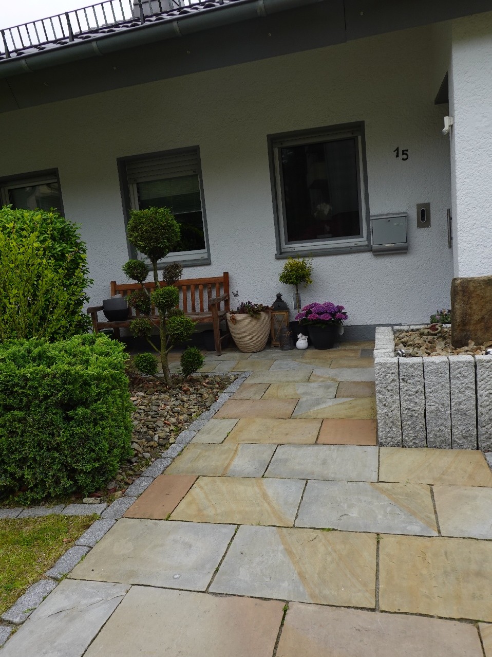 Das zunächst mit einer Ebene sichtbare Haus, entpuppt sich später als Raumwunder. Durch den liebevoll gestalteten Vorgarten führt eine moderne Pflasterung zum überdachten Eingangsbereich. Dieser ist mit einer modernen und mehrfachverriegelten Eingangstür mit Glaseinsatz versehen. Sie betreten das Haus und befinden sich zuerst in einem Windfang mit bodentiefen Fenstern, Garderobe und einem angrenzenden und neu gestalteten Gäste- WC.