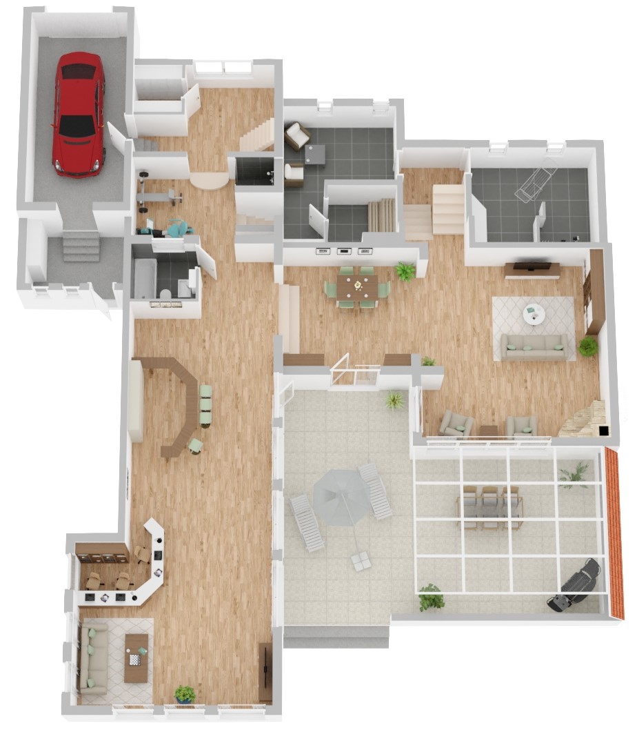 Das an den Essbereich angrenzende ehemalige ca. 90 m große Schwimmbad verfügt ebenfalls über einen Blick und Zugang in den Garten. Diesen Bereich können Sie ganz individuell als Paradies für Film-/, Sport-/ und Spieleliebhaber nutzen. Ein weiteres Bad sowie die offene Verbindung zum belichteten Innenhof mit Ruhebereich und Dusche runden auch diesen Bereich ab.