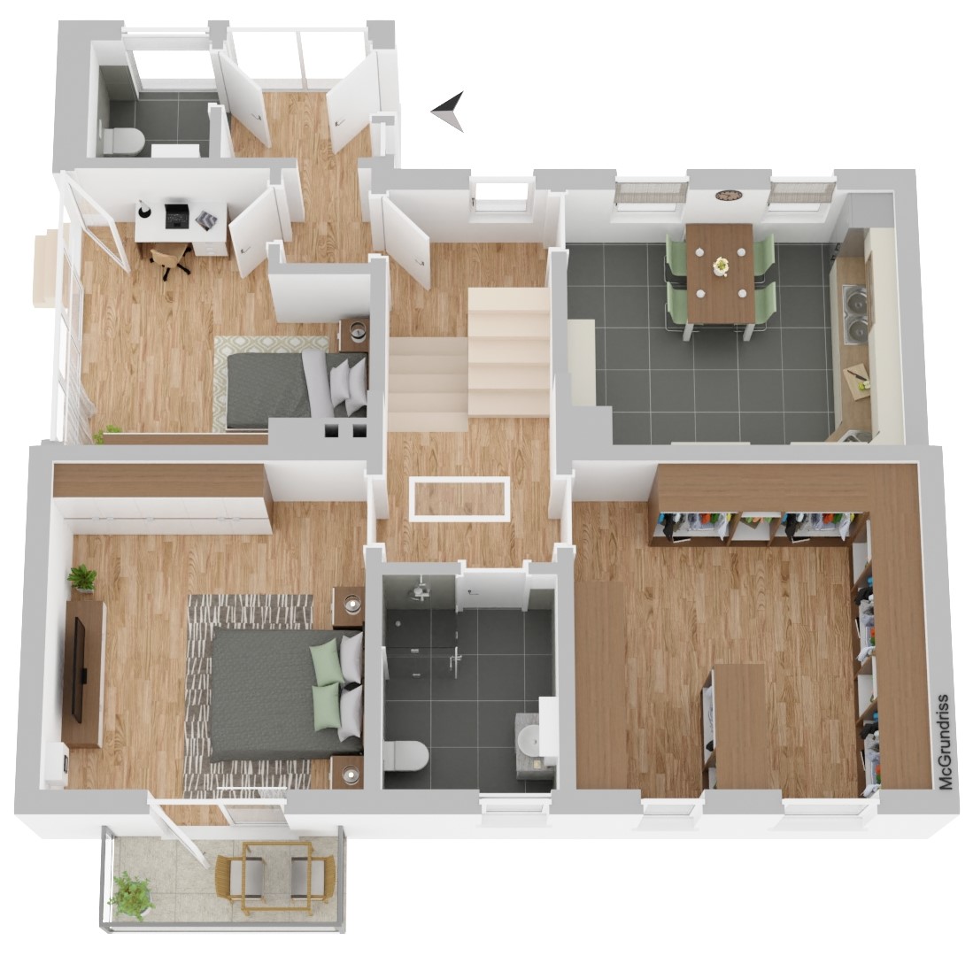 Über den zentralen Flurbereich verteilen sich die weiteren Flächen nach rechts und links. Zur rechten Seite befindet sich ein Gäste-/ oder Arbeitszimmer. Dieses wiederum hat über eine kleine Treppe einen direkten Zugang zum Zwischentrakt mit Duschbad und einem überdachten und belichteten Innenhof.