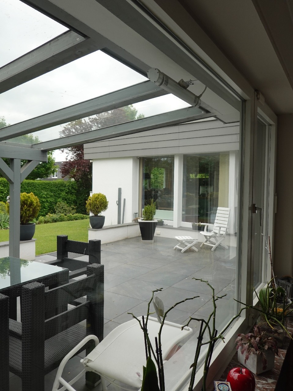 ca. 60 m² große Terrasse mit Glasüberdachung (Baujahr 2014); beide Bereiche mit Südausrichtung