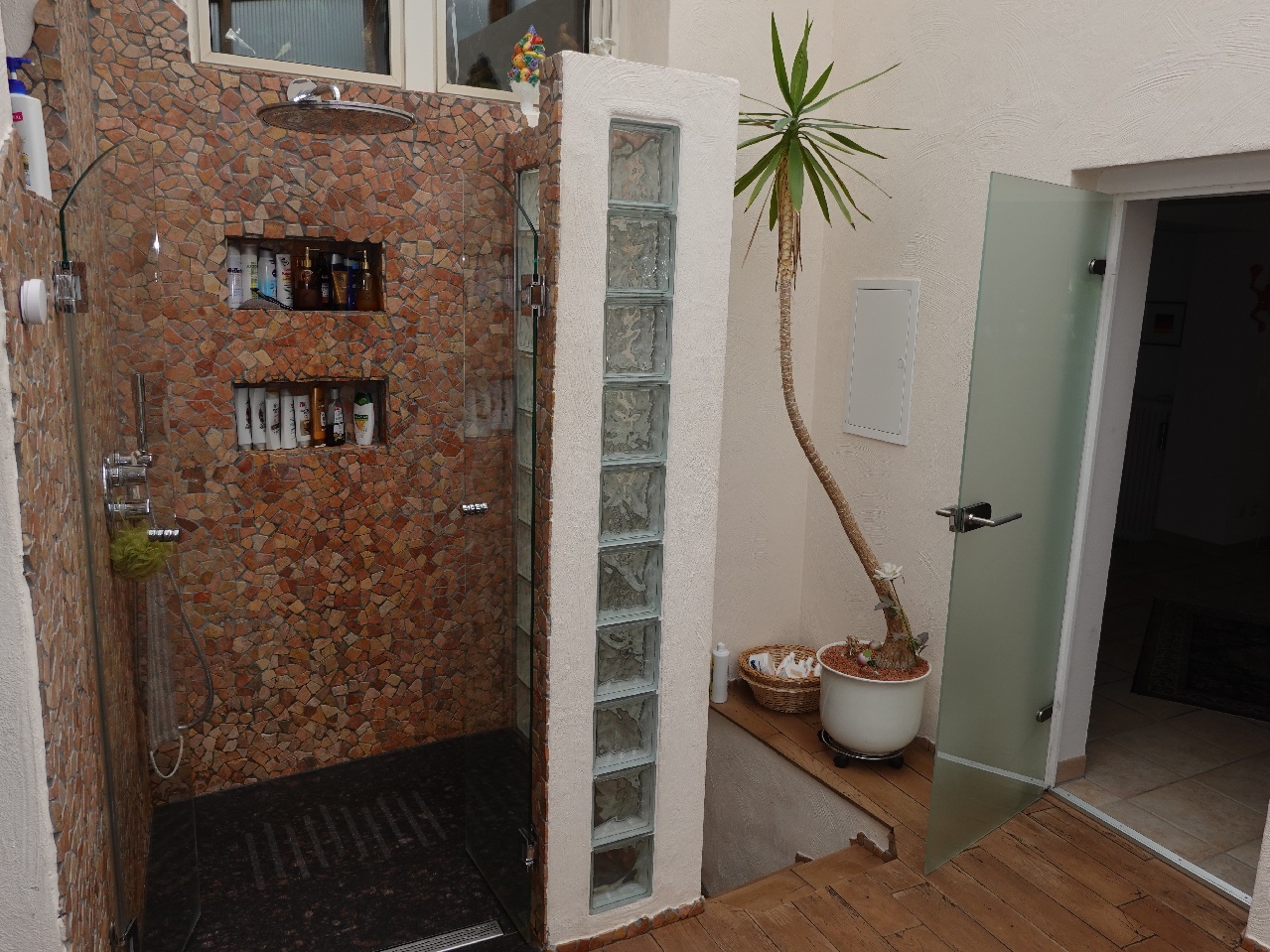 Badezimmer: Zwei Tageslichtbäder, im OG mit großformatigen Fliesen und Walk-In-Dusche (Baujahr 2015), im UG mit Badewanne. Weitere Walk-In-Dusche im Zwischentrakt