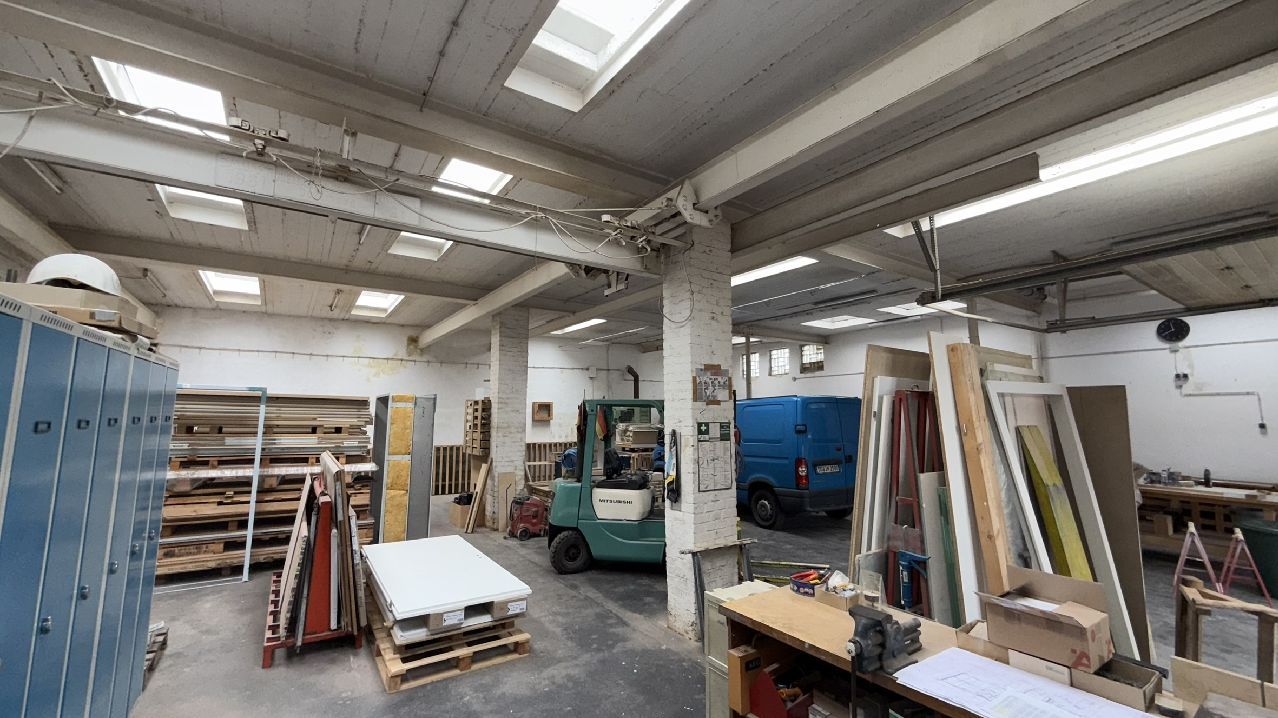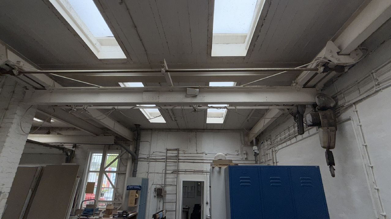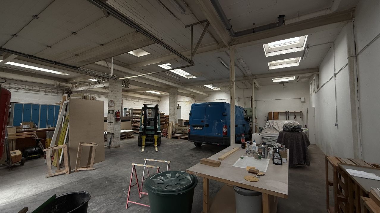 Halle: beheizt (Öl), Sektionaltor, ebenerdige Andienung, Brückenkran 2 Tonnen, Laufkatze (Hinweis: nicht in Betrieb).