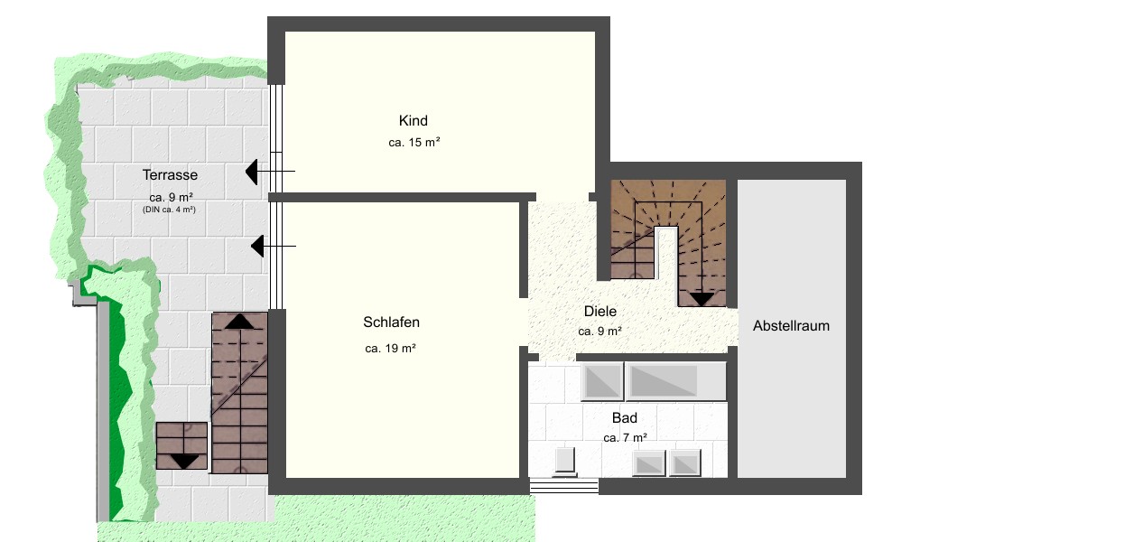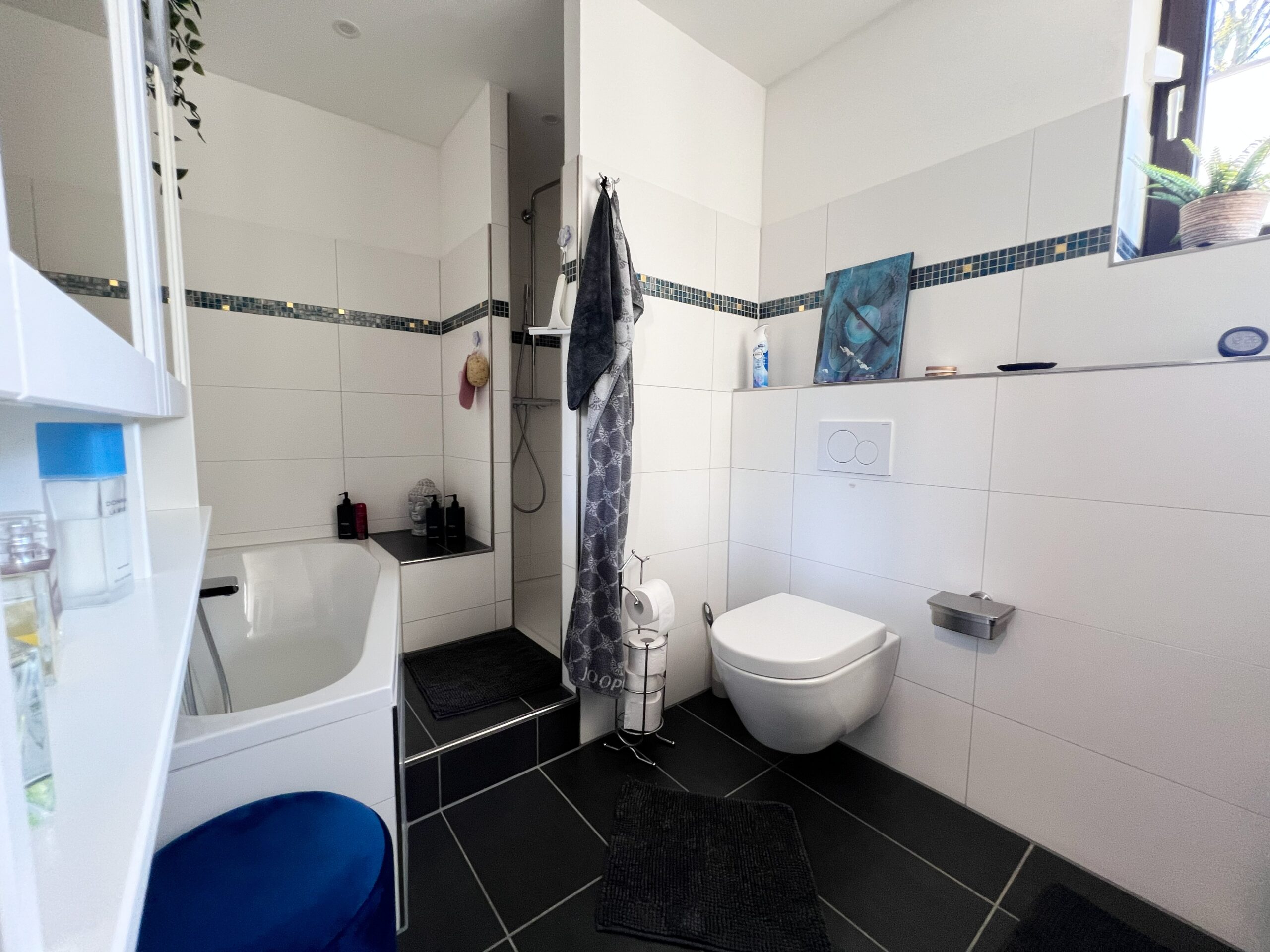 - Badausstattung: Dusche, Badewanne, Fenster