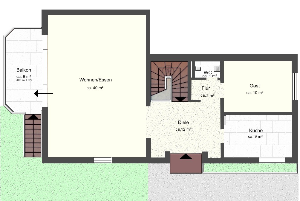 Erdgeschoss: Wohn-/Esszimmer mit Balkon, Küche, Zimmer, Gäste-WC, Diele