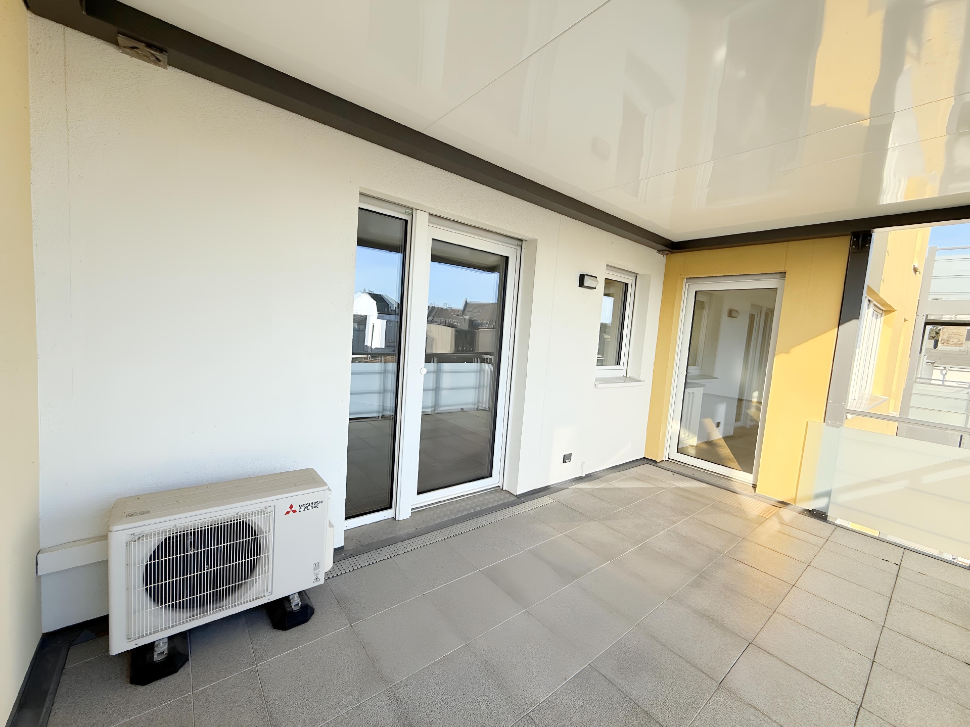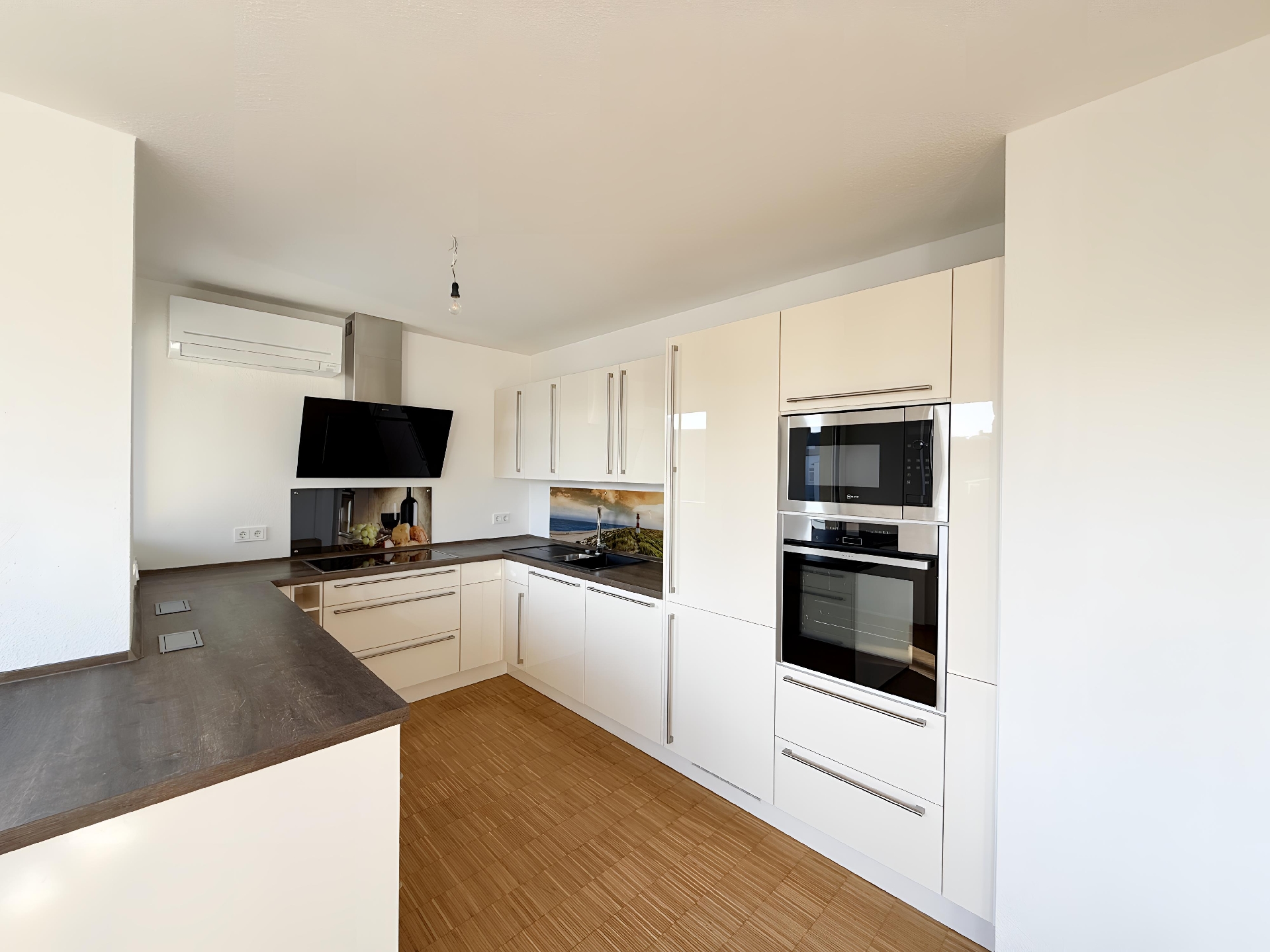 Der offene Wohn- und Essbereich mit großen Fensterflächen bildet das Herz der Wohnung. Hier sorgt der hochwertige Parkettboden für Wärme und Eleganz, während die offene Küche das moderne Wohnkonzept ideal ergänzt. Das Schlafzimmer dient als ruhiger Rückzugsort mit direktem Balkonzugang und eingebauter Klimaanlage. Zwei weitere Zimmer bieten vielfältige Nutzungsmöglichkeiten – ob als Kinderzimmer, Gästezimmer oder Homeoffice.