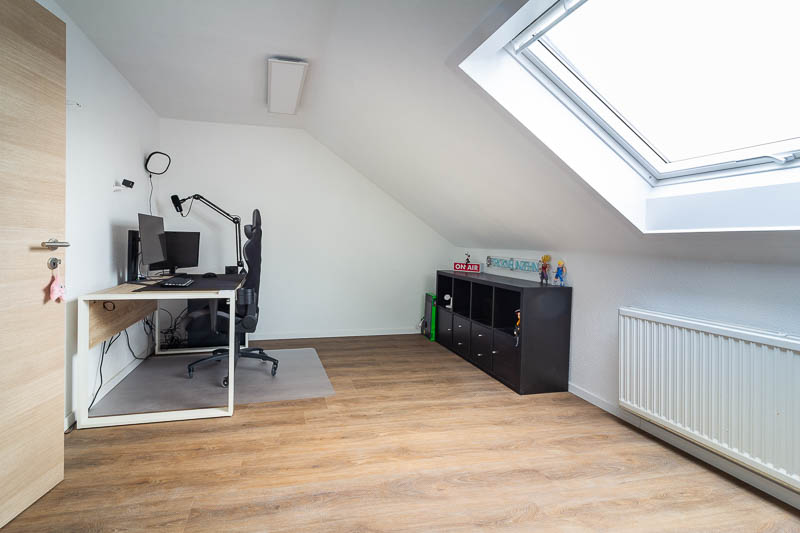 Das Dachgeschoss wurde wohnlich ausgebaut und bietet einen weiteren Raum, der sich bestens als Büro oder Gästezimmer eignet. Auch hier sind bereits Modernisierungen erfolgt. Ein angrenzender Abstellraum ergänzt den Bereich, muss jedoch noch fertiggestellt werden, um ihn als praktische Nutzfläche zu verwenden.