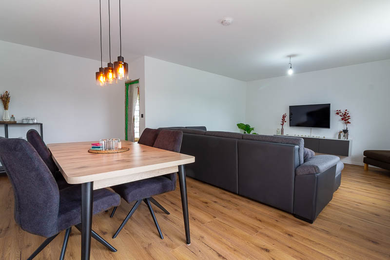 Der Wohn- und Essbereich bildet das Herzstück des Hauses. Große Fensterfronten sorgen für ein freundliches, lichtdurchflutetes Ambiente und gewähren den direkten Zugang auf die sonnige Südwest-Terrasse. Von hier genießen Sie den Blick in den gepflegten Garten, der Raum für Entspannung und Spielfreude zugleich bietet. Die angrenzende Küche ist funktional geschnitten und sorgt für kurze Wege beim Kochen und Servieren.