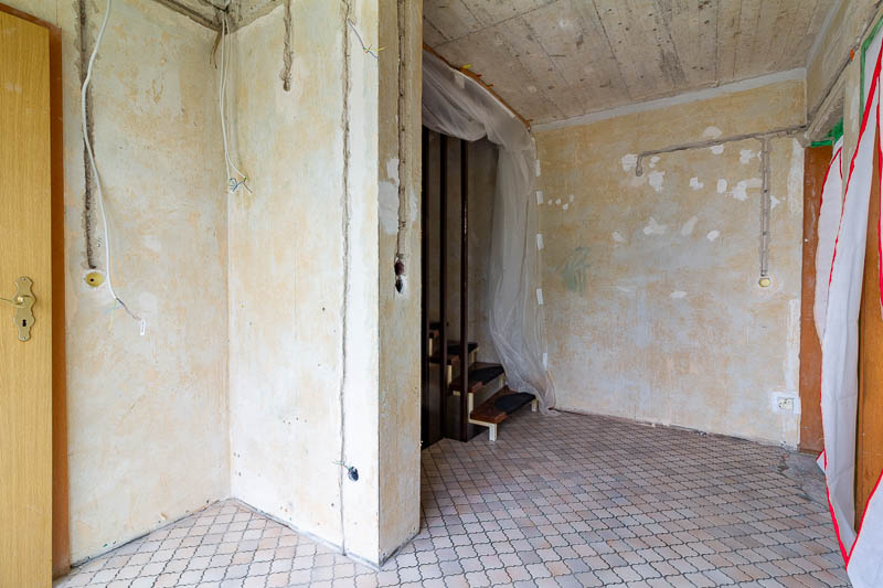 Schon beim Betreten empfängt Sie ein heller Eingangsbereich mit Gäste-WC. Hier wurden bereits Arbeiten vorgenommen, der Flur ist jedoch noch nicht vollständig fertiggestellt – so bleibt Heimwerkern die Möglichkeit, eigene Ideen einzubringen und diesem Bereich eine persönliche Note zu verleihen.