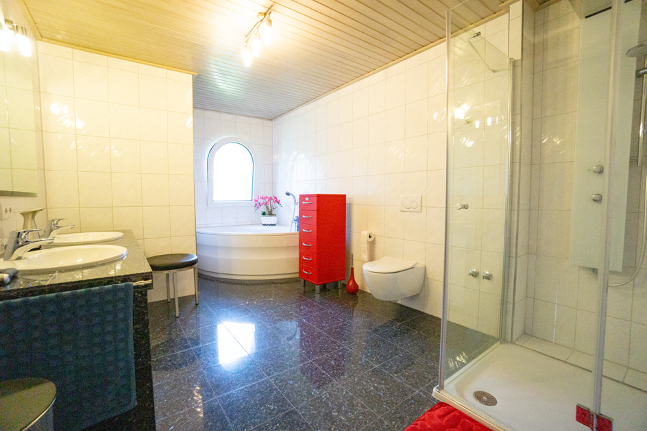 Die hochwertige Ausstattung des Hauses spiegelt sich z. B. in Granitböden, Blue-Pearlgranit im Badezimmer, Vinylböden, teilw. elektrische Rollos und hochwertige Einbauküche wider.