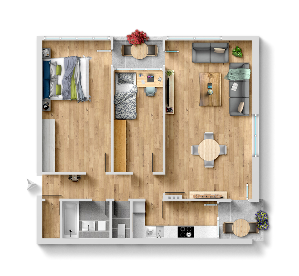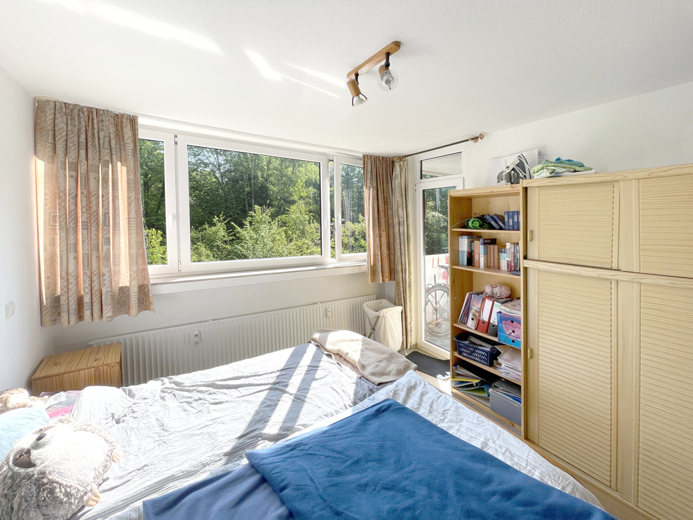 Alle Zimmer, bis auf das Kinderzimmer, haben Zugang zu den beiden Loggien die sowohl nach Osten als auch nach Süden ausgerichtet sind. Das grosse Schlafzimmer und das Kinderzimmer haben Morgensonne. Das ebenfalls grosse und geräumige Wohn-/ Esszimmer bietet viel Platz für Ihr Mobiliar. Sie können nach Herzenslust aussuchen wonach Ihnen gerade ist, ob Sie in der Morgensonne frühstücken oder in der Abendsonne den Abend ausklingen lassen. Die Küche ist eine klassische Arbeitsküche und der Abstellraum befindet sich neben dem Wohnungseingang. Zudem bietet der Flur, von dem aus Sie alle Räume betreten können, genug Platz für eine Garderobe.